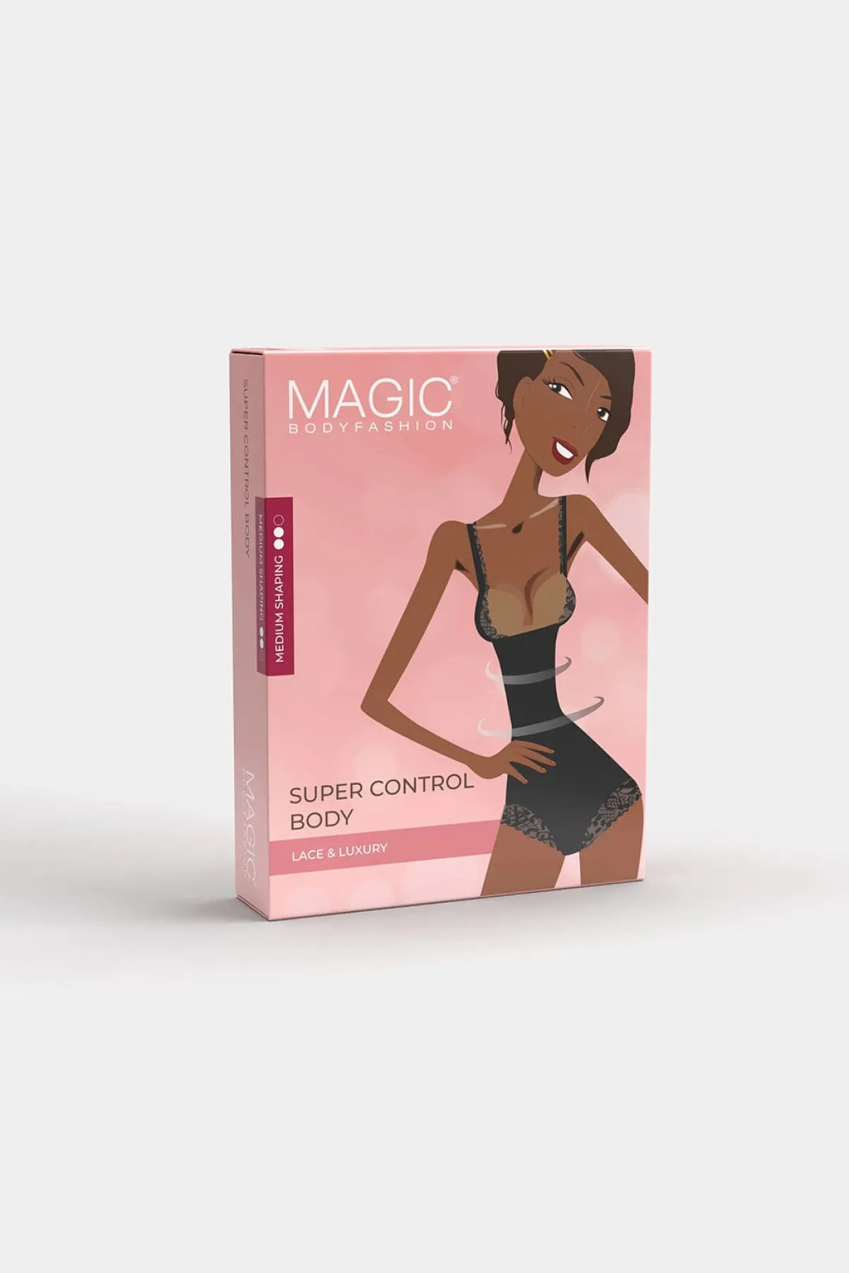 Formgebender Body in der Farbe Latte/Beige mit weicher Spitze und leichtem Netzstoff. Mittlere Formung von Bauch, Taille und Rücken.