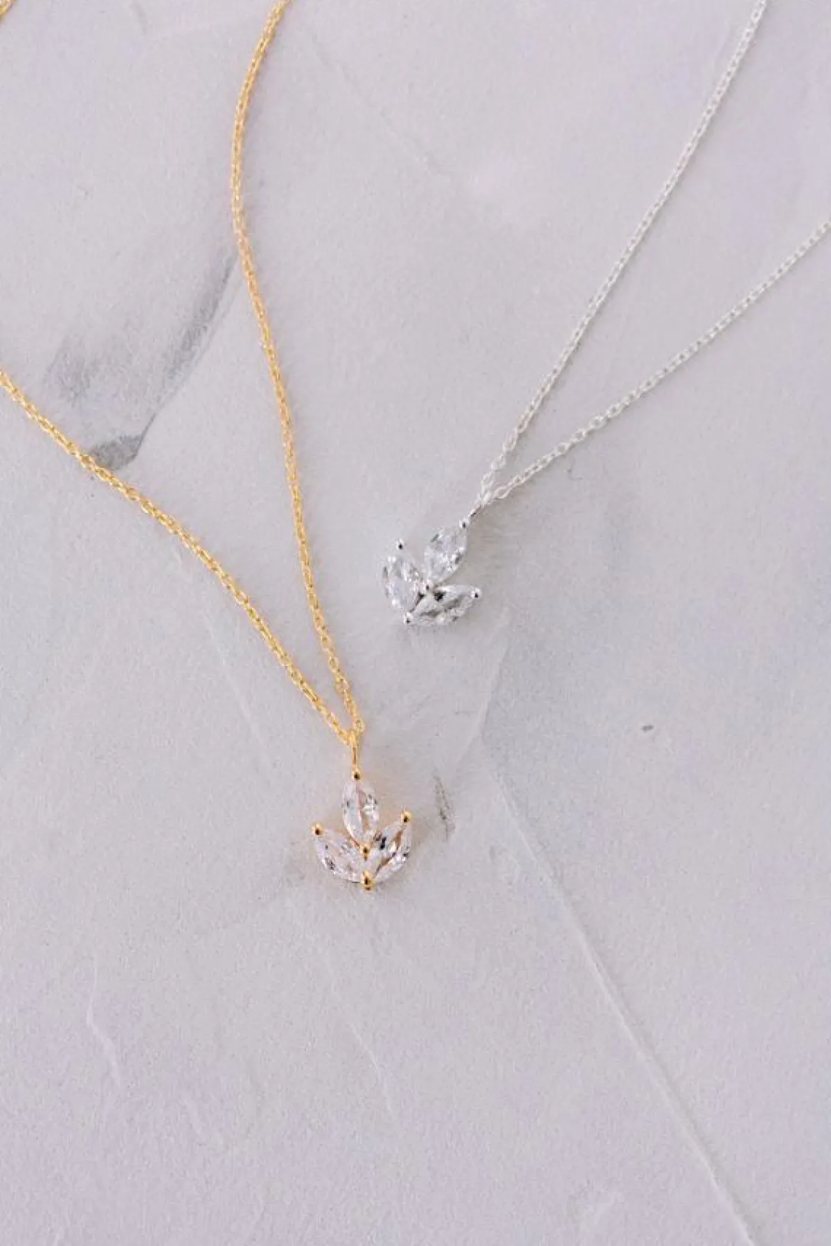 Diese filigrane Halskette, geschmückt mit einem Anhänger aus Zirkonia-Kristallen in Blätteroptik, ist ein dezenter und gleichzeitig femininer Hingucker. Die klassische und dennoch extravagante Brautkette ist sie das perfekte Accessoire zur Hochzeit und später eine wertvolle Erinnerung an den schönsten Tag im Leben.