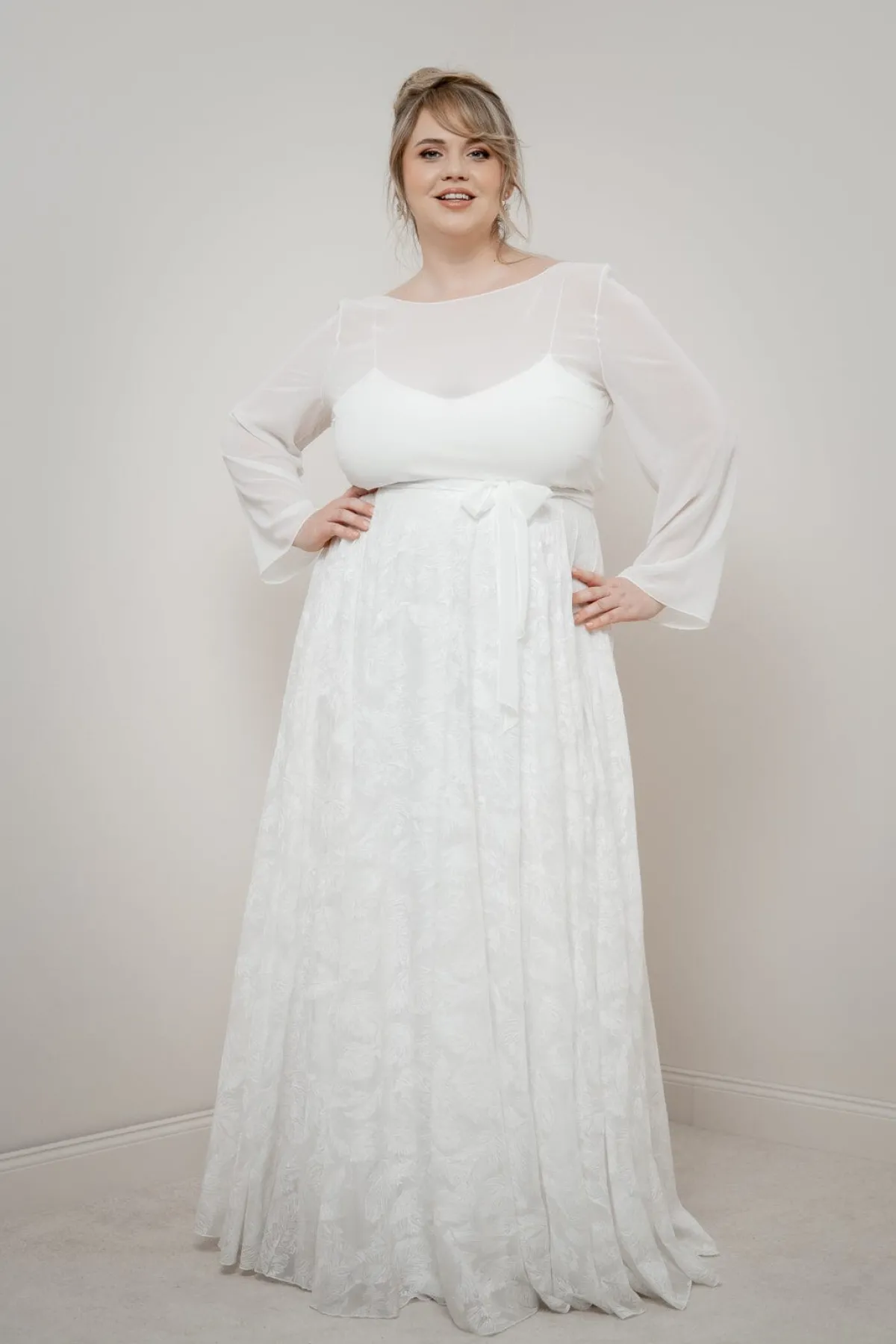 Es müssen nicht immer Blüten oder Perlen sein: Gillianne ist ein Braut Rock aus fließend fallendem Chiffon mit einem originellen Federmuster.