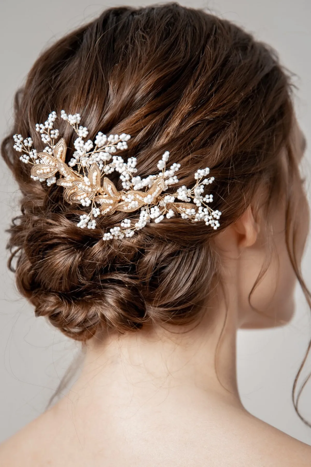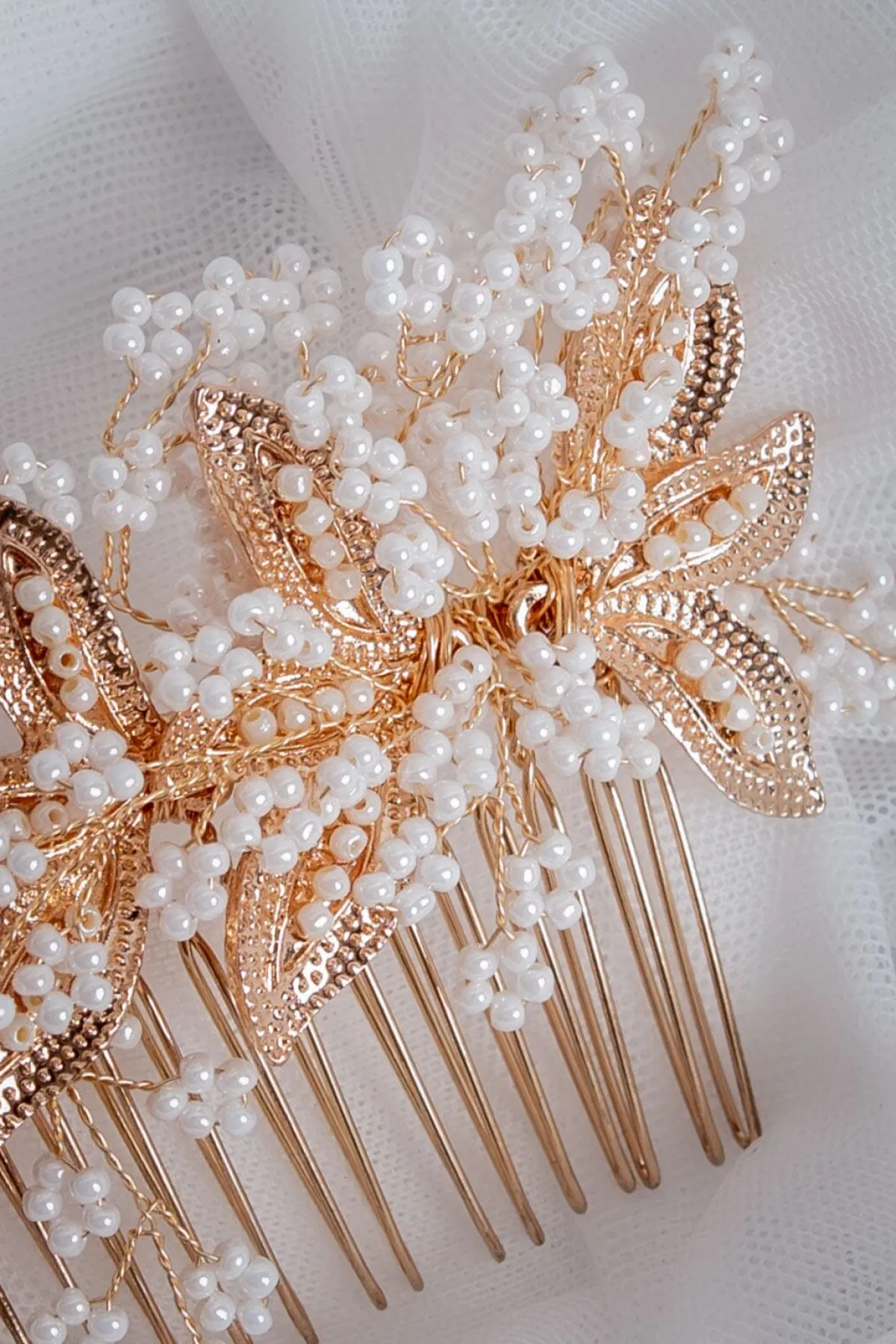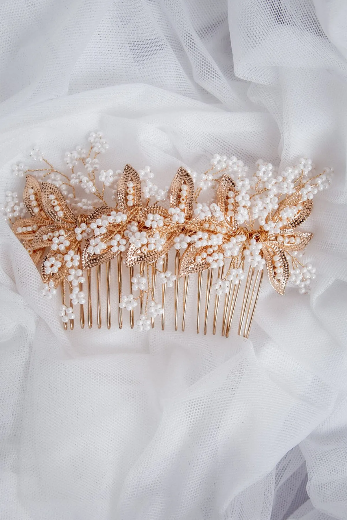 Dieser extravagante Haarkamm lässt Brautherzen höher schlagen: Goldfarbene Blätter und weiße Kunstperlen in stilisierter Blütenform ergeben ein echtes Statement Piece für Romantikerinnen. Elegant und feminin, verspielt und charmant schenkt er deiner Braut Frisur ein erhabenes Finish.