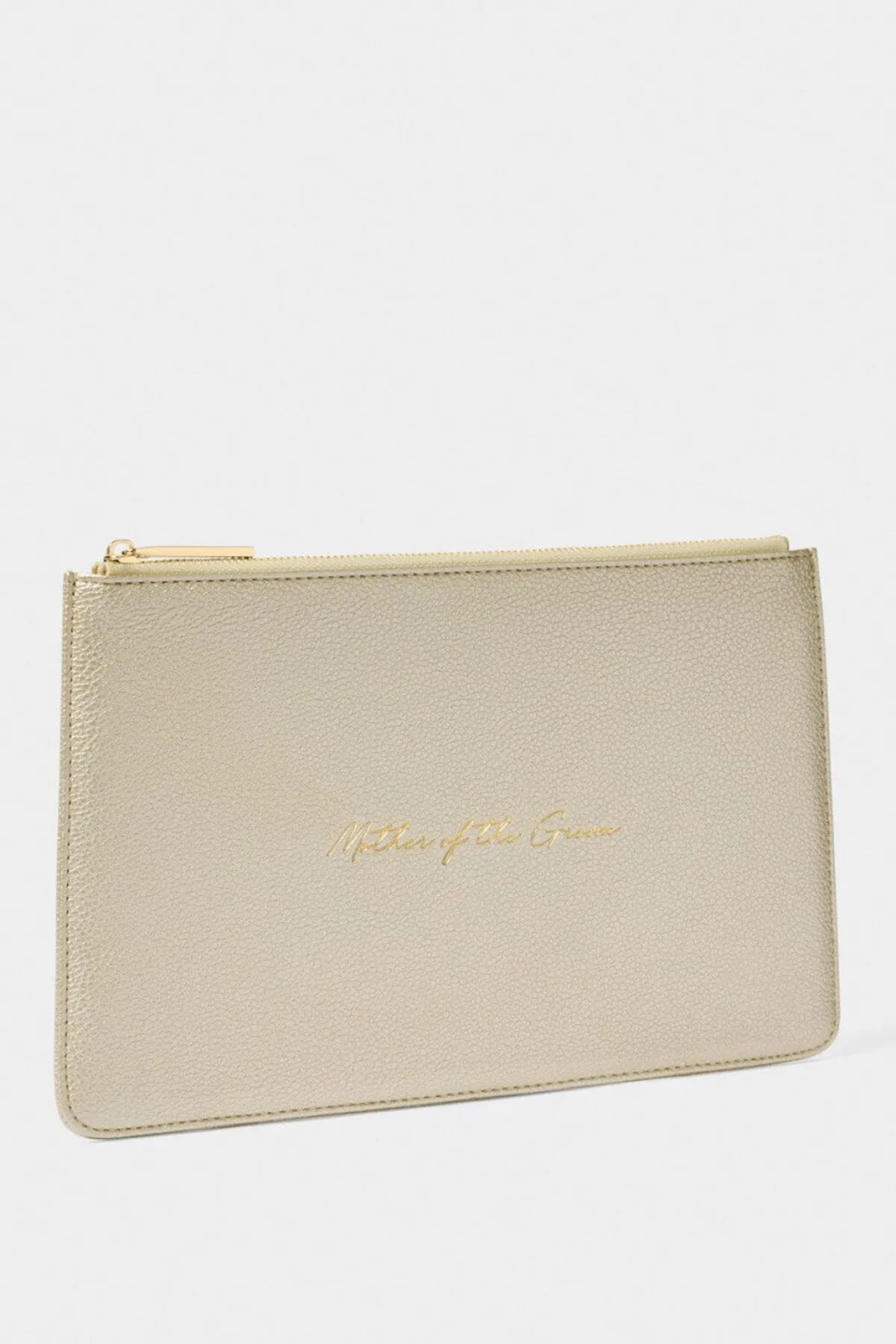 Diese kleine goldfarbene Clutch mit Metallic-Effekt ist unkompliziert, modisch und eignet sich bestens dafür, der Mutter des Bräutigams die frohe Botschaft vorab zu verkünden. Mit farblich passender „Mother of the Groom“-Prägung im Handlettering-Style ist die Pouch ein persönliches und originelles Accessoire.
