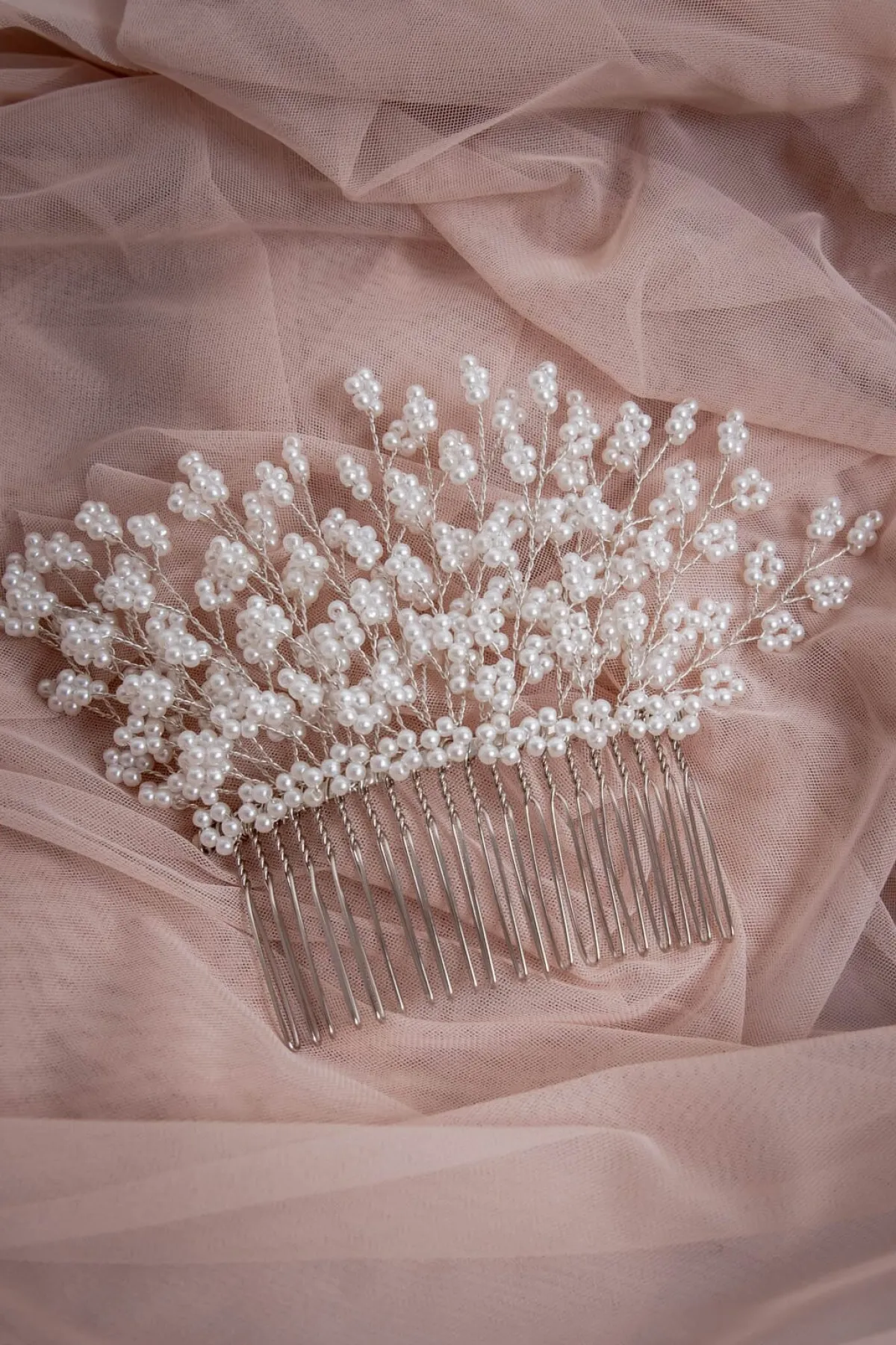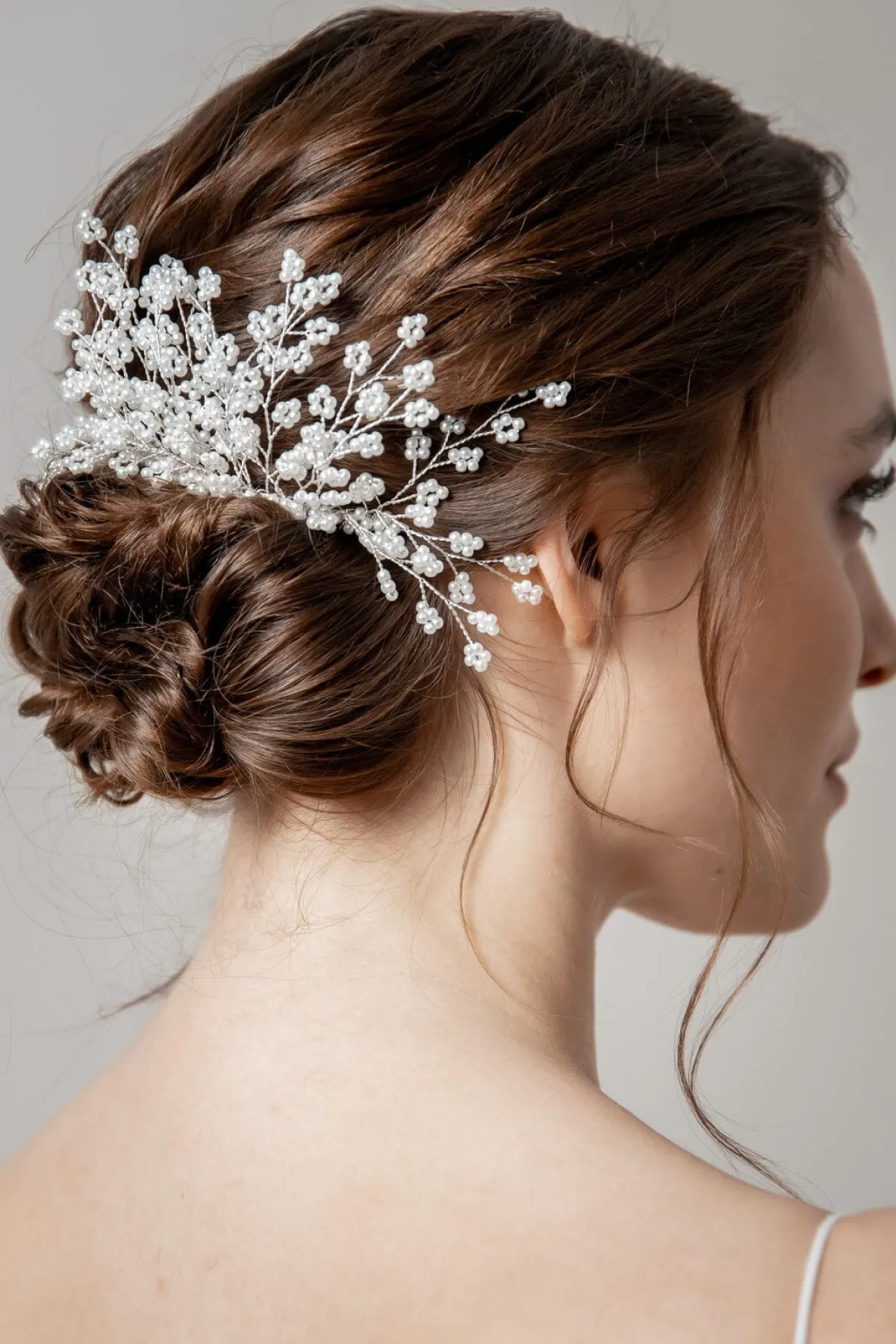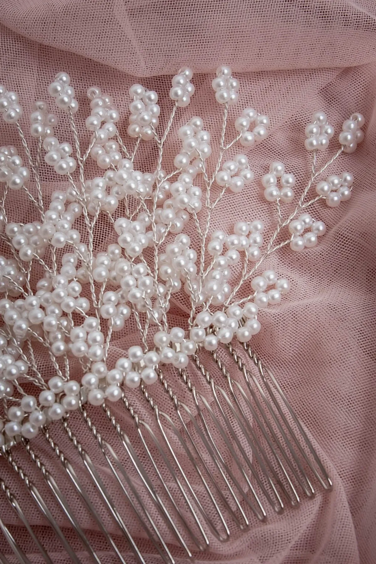 Dieser große, silberne Braut Haarkamm ist ein wunderschönes Accessoire für jede Hochzeit. Kunstvoll geflochten aus Metall und verziert mit weißen Perlen, die in einer stilisierten Blütenform arrangiert sind – er ist der perfekte romantische Look mit Boho Flair.