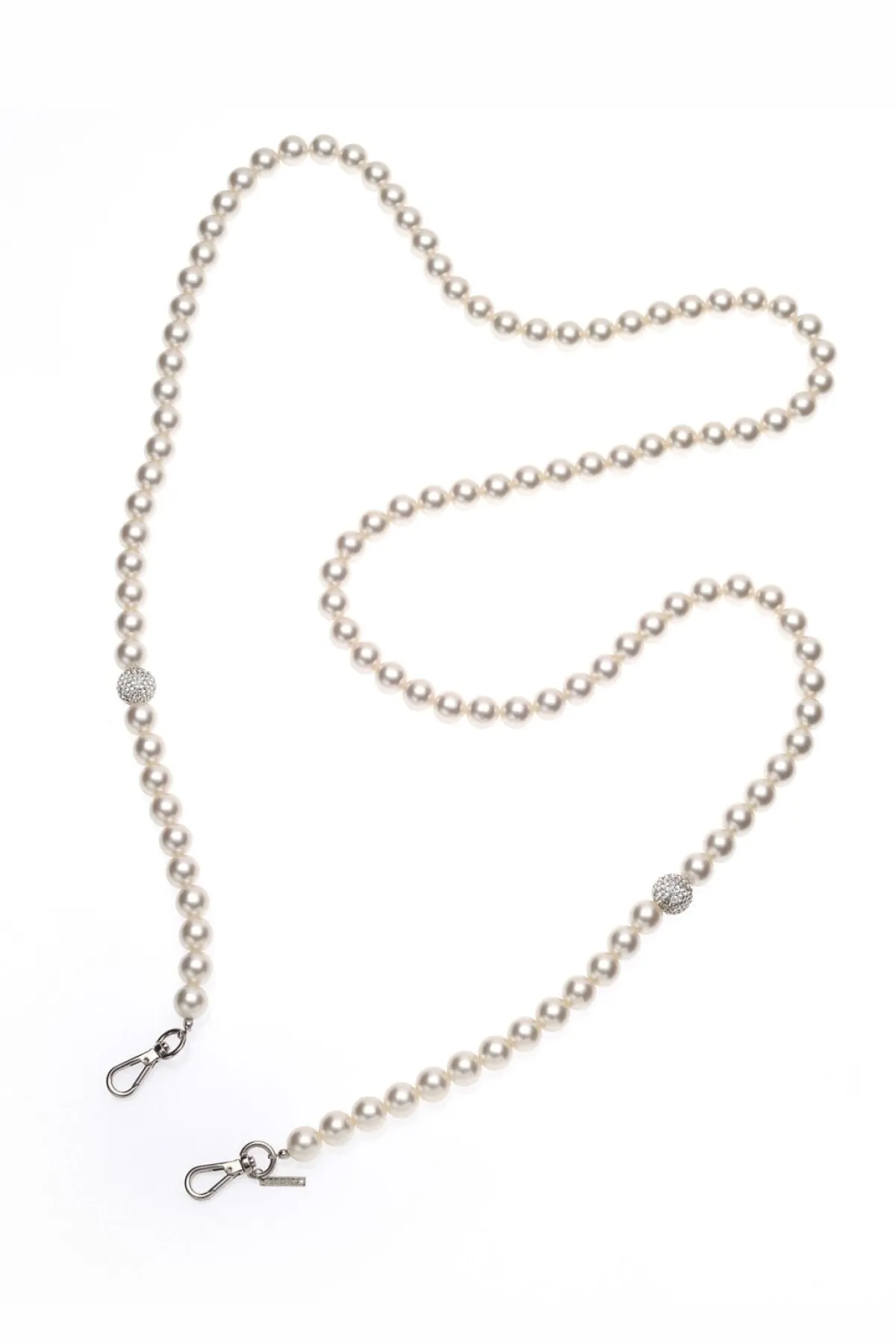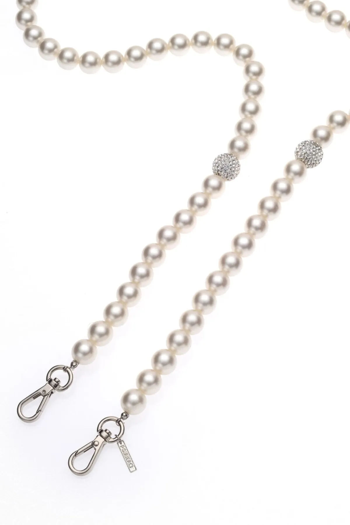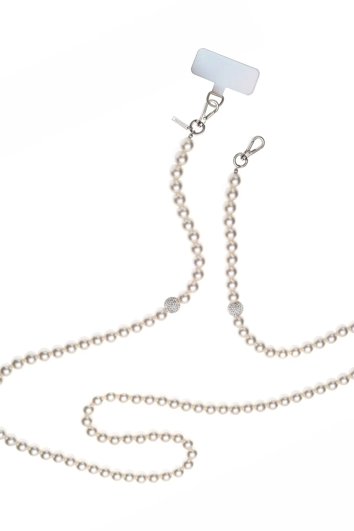 Extravagantes Accessoire mit luxuriösem Touch – nicht nur zur Hochzeit! Die lange Handykette ist verziert mit schimmernden Kunstperlen in Ivory und zwei funkelnden Strasskugeln. Durch die großen Ösen lässt sich die Handykette problemlos an der Handyhülle fixieren.
