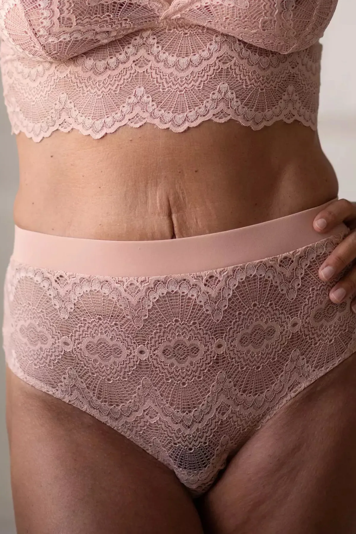 Die High-Waist Form des femininen Slips aus zarter Spitze und Elasthan umschmeichelt dank des hohen Bundes deinen Hüftbereich. In der Taille schließt er mit einem weichen, elastischen Gummibund ab, ohne deinen Bauch einzuschnüren.
