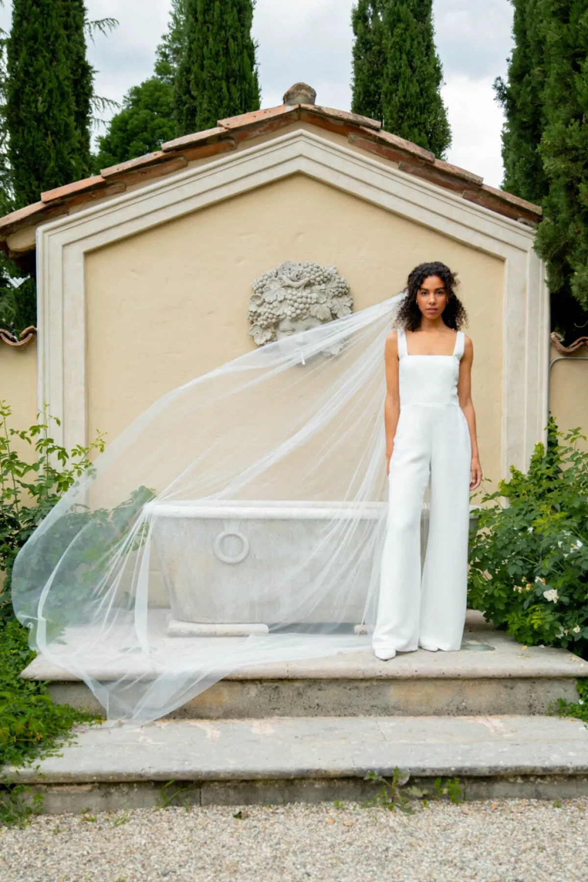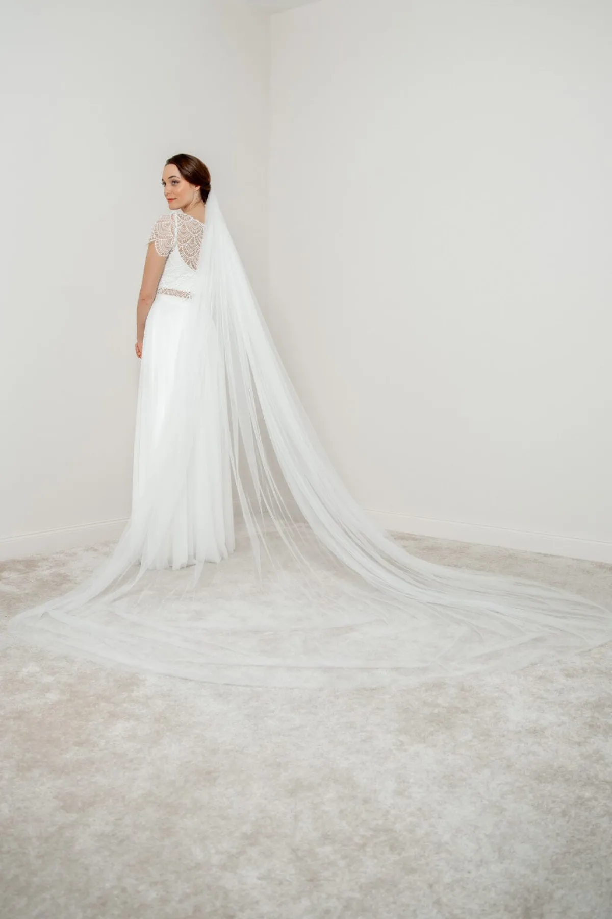 Zeitloser Schleier aus einlagigem Softtüll in klassischem Ivory. In dramatischer Kathedralen-Länge besonders gut für Bräute geeignet, die den großen Auftritt lieben.