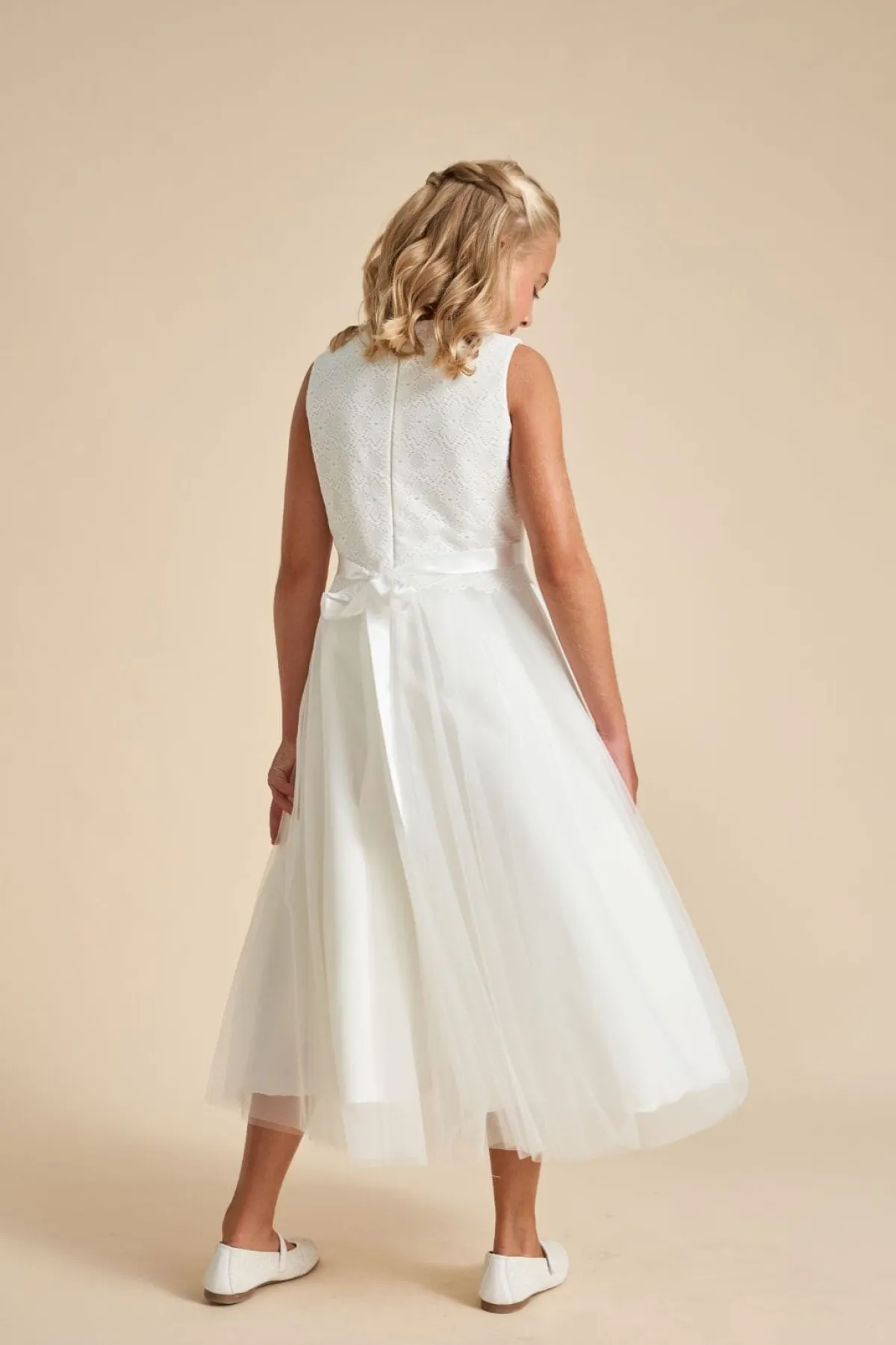 Schön schwingendes, ärmelloses Kommunionkleid in 7/8-Länge mit glitzerunterlegtem zarten Spitzenoberteil und blütenverziertem Satinband zur Weitenregulierung für eine bequeme Passform.