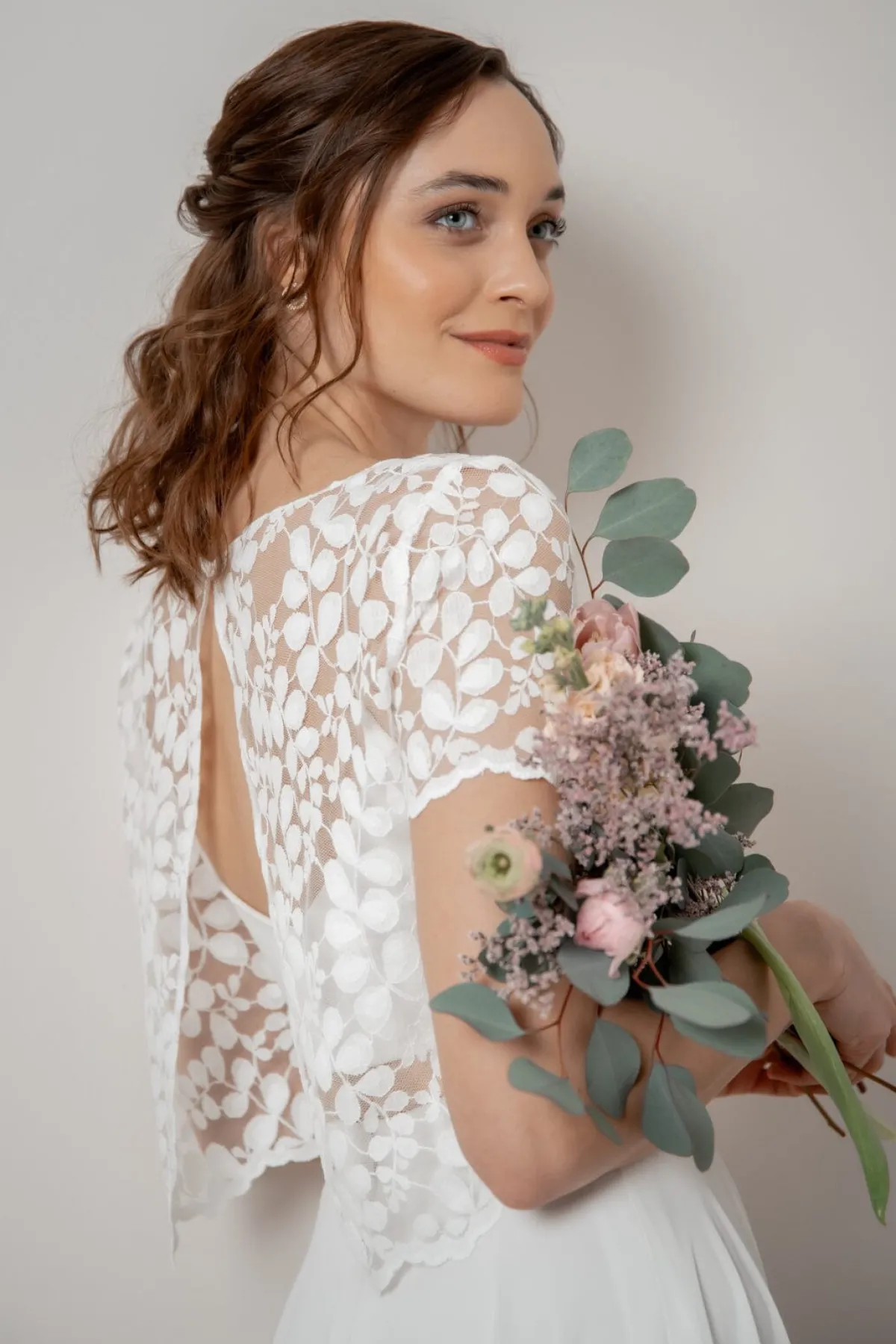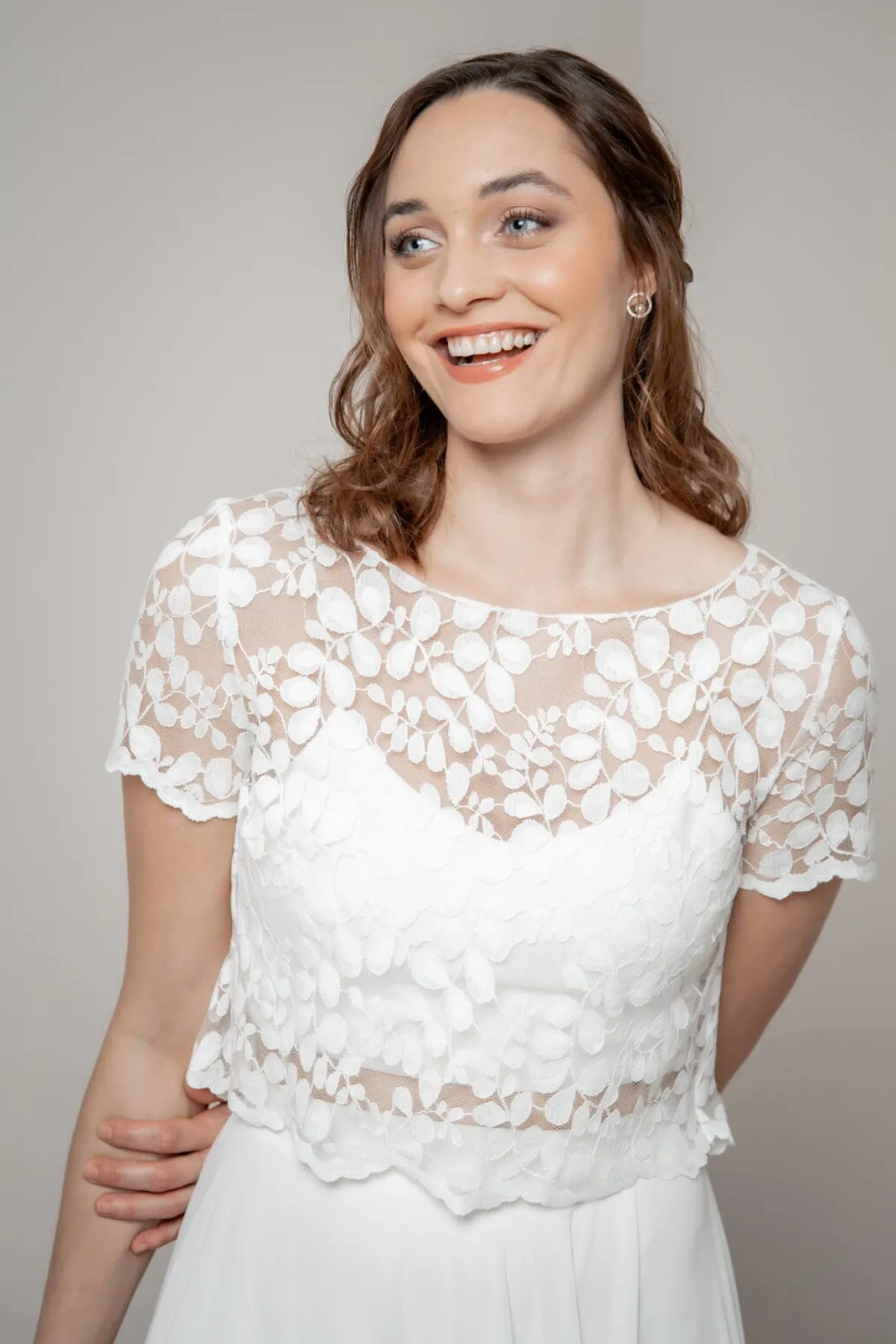 Mit Aza präsentieren wir dir endlich eine Kurzarm-Variante unseres Norine-Bestsellers. Wie seine Schwester ist Aza aus der beliebten Blätterspitze gefertigt und mit dekorativen Bodenkanten an Ärmeln und Saum ausgestattet. Ein neues Detail ist der luftige Rückenschlitz, der ihm eine entzückende Jäckchen-Optik verleiht.