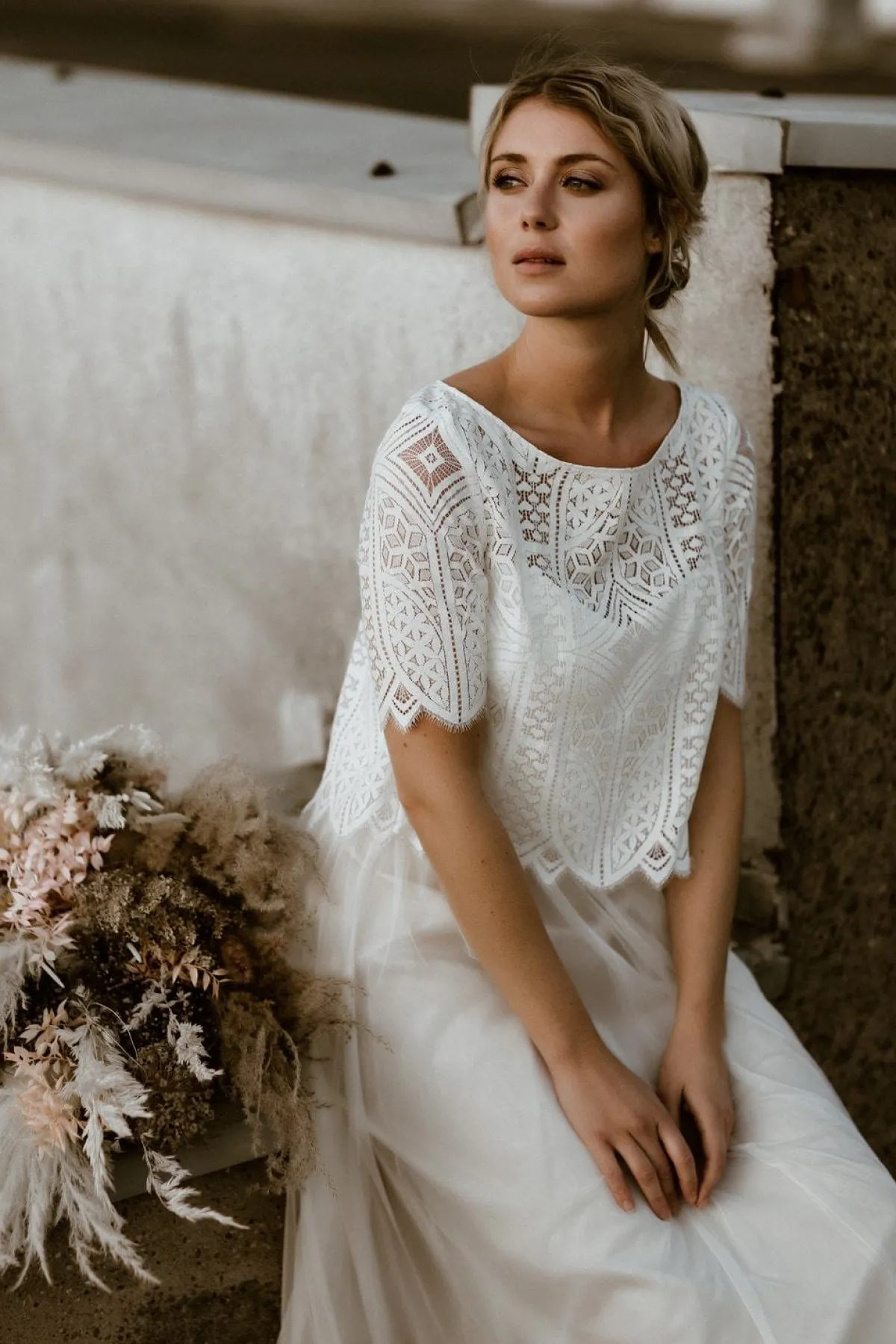 Calista in Ivory weiß wie ihre Vorgängerinnen Louise Ivory und June zu begeistern: Das dekorative Muster aus floralen und grafischen Elementen aus fester Spitze macht auch mit kurzen Ärmeln eine gute Figur.