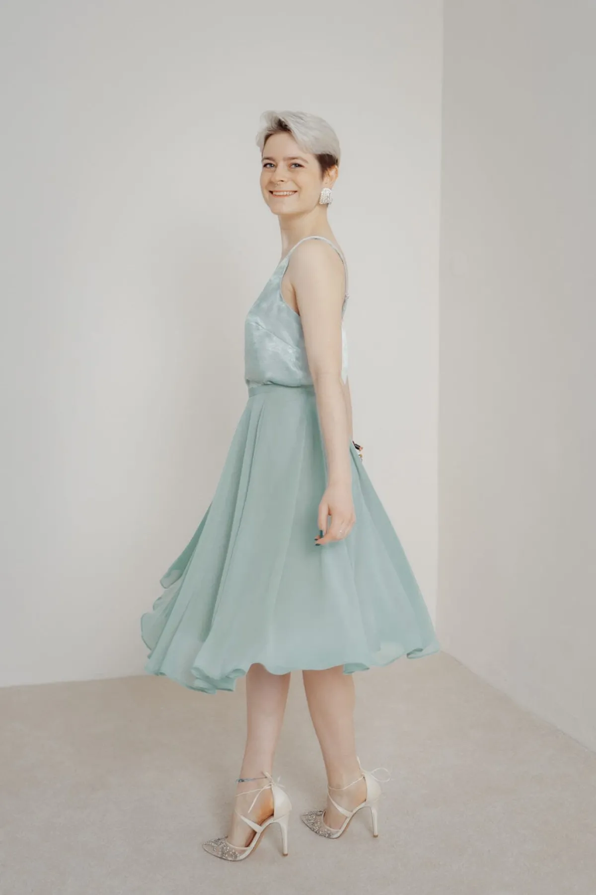 Fließend fallender, kurzer Rock aus mintgrünem Chiffon für Hochzeitsgäste, Brautjungfer oder die Trauzeugin.