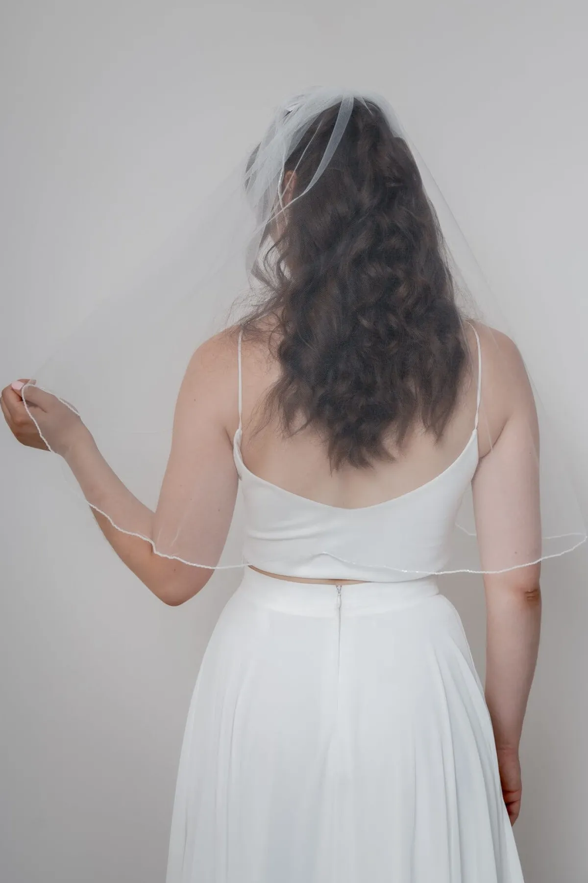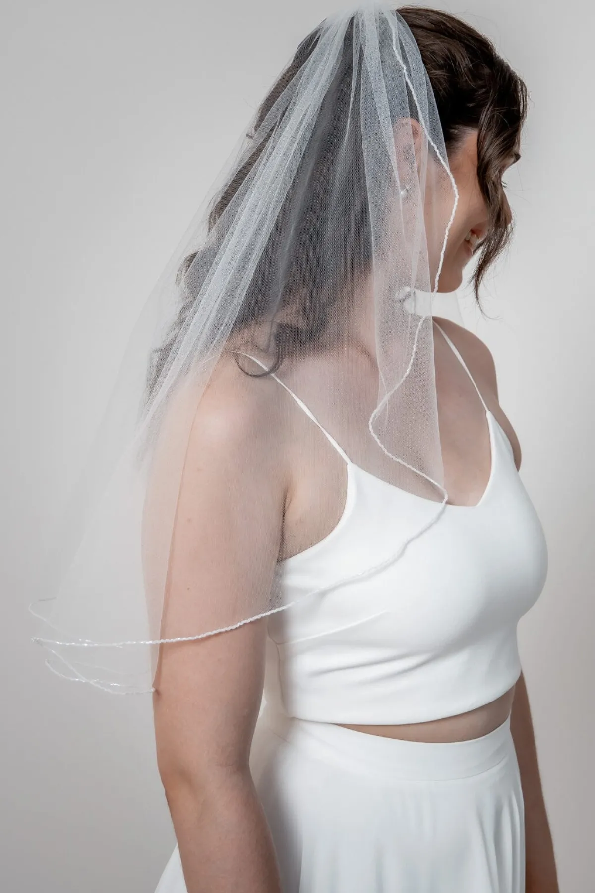 Schlichter Brautschleier aus elfenbeinfarbenem Tüll mit applizierten funkelnden Schmucksteinen.