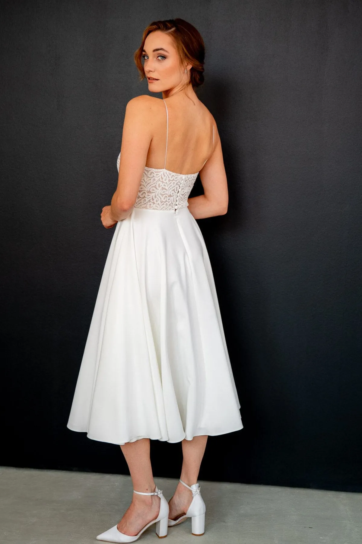 Junia ist ein Hochzeitskleid in Wadenlänge für einen romantisch-sinnlichen Look am großen Tag. Ein Oberteil mit Vintagemuster und zarten Spaghettiträgern trifft auf einen Rock aus fließend fallendem Crêpe für eine feminine Silhouette.
