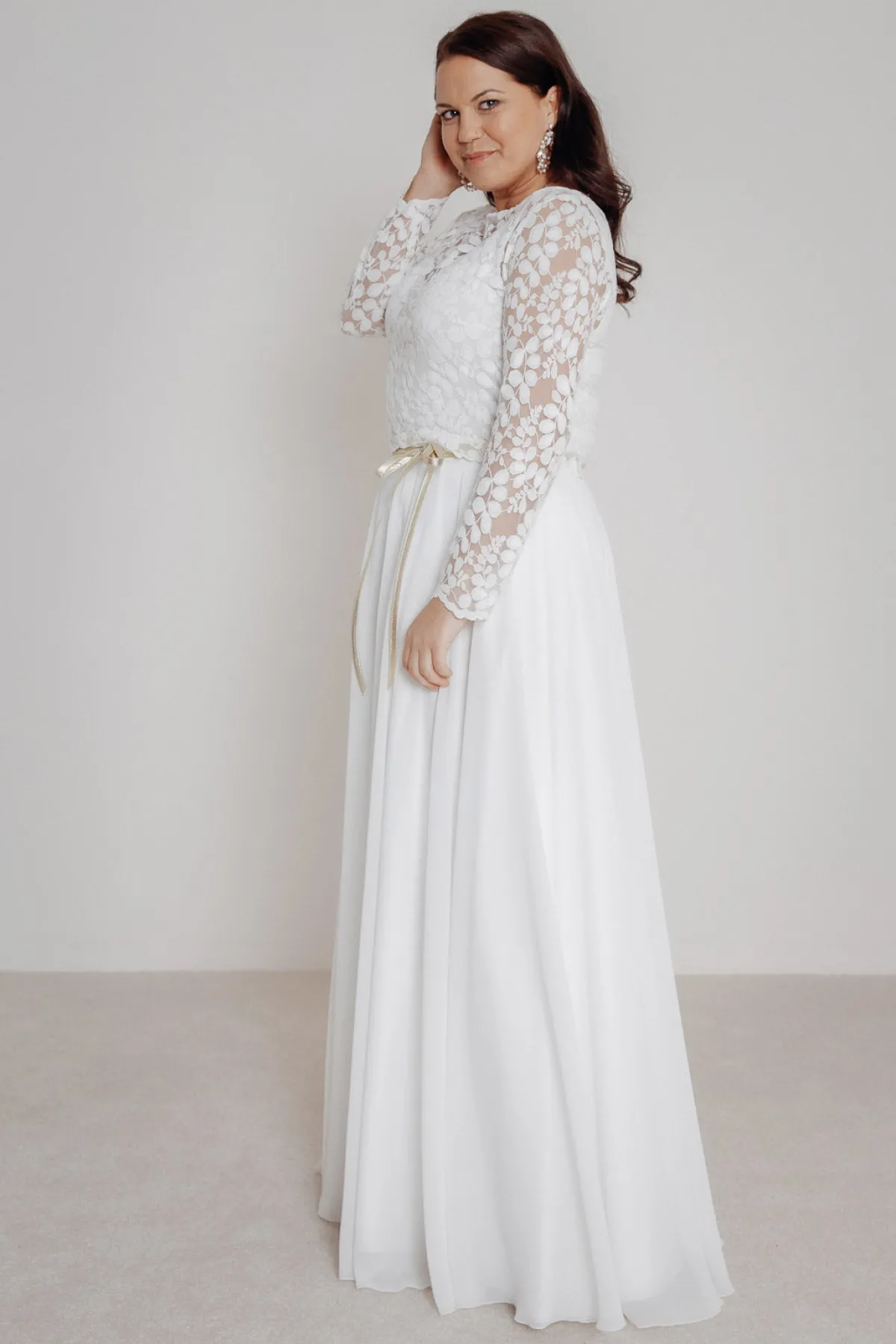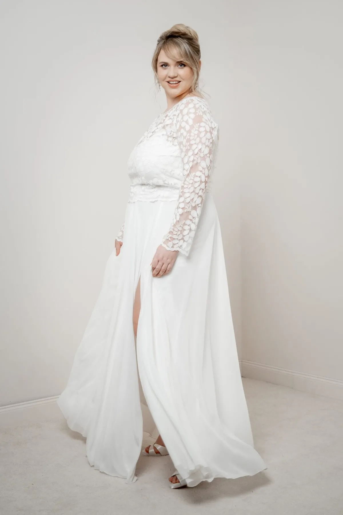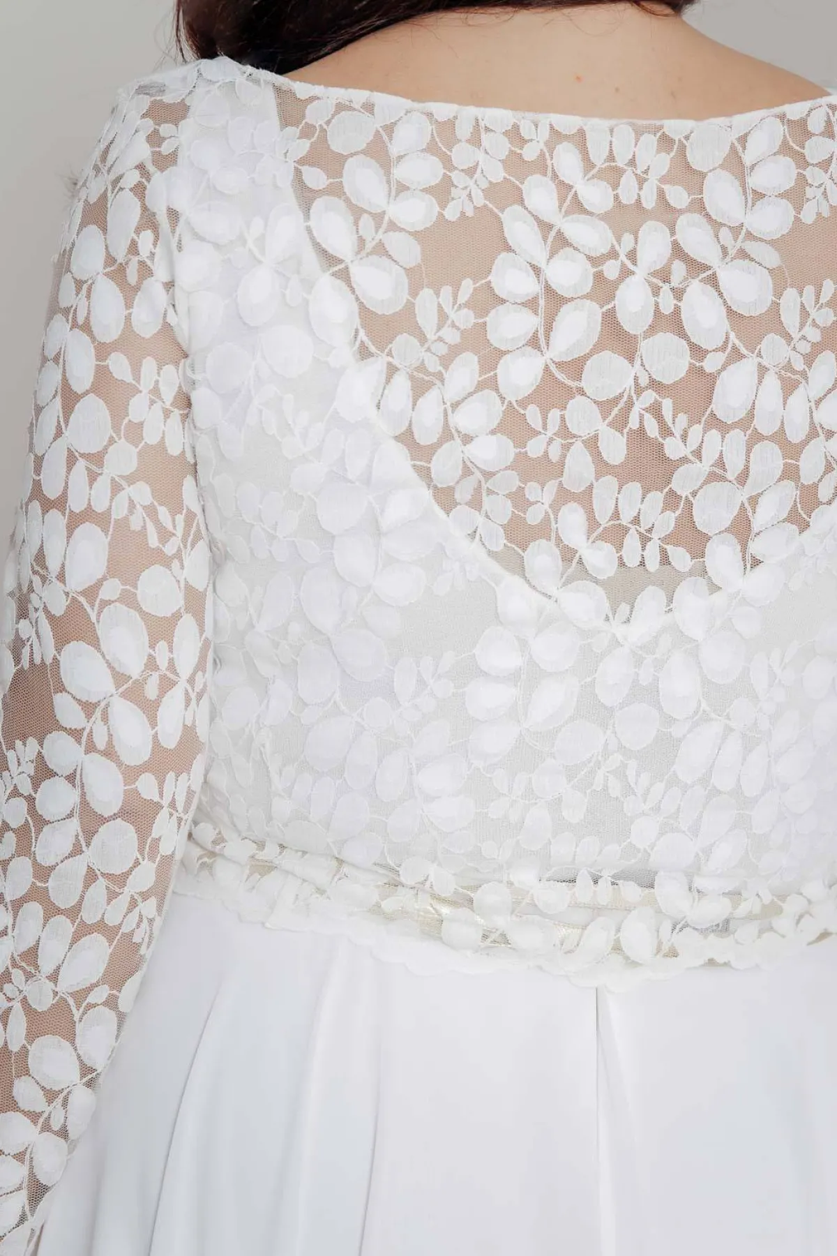Endlich auch in großen Größen erhältlich, kannst du das Langarm-Top mit vielen unserer Braut Röcke oder über einem einteiligen Hochzeitskleid als modischen Zweiteiler inszenieren.