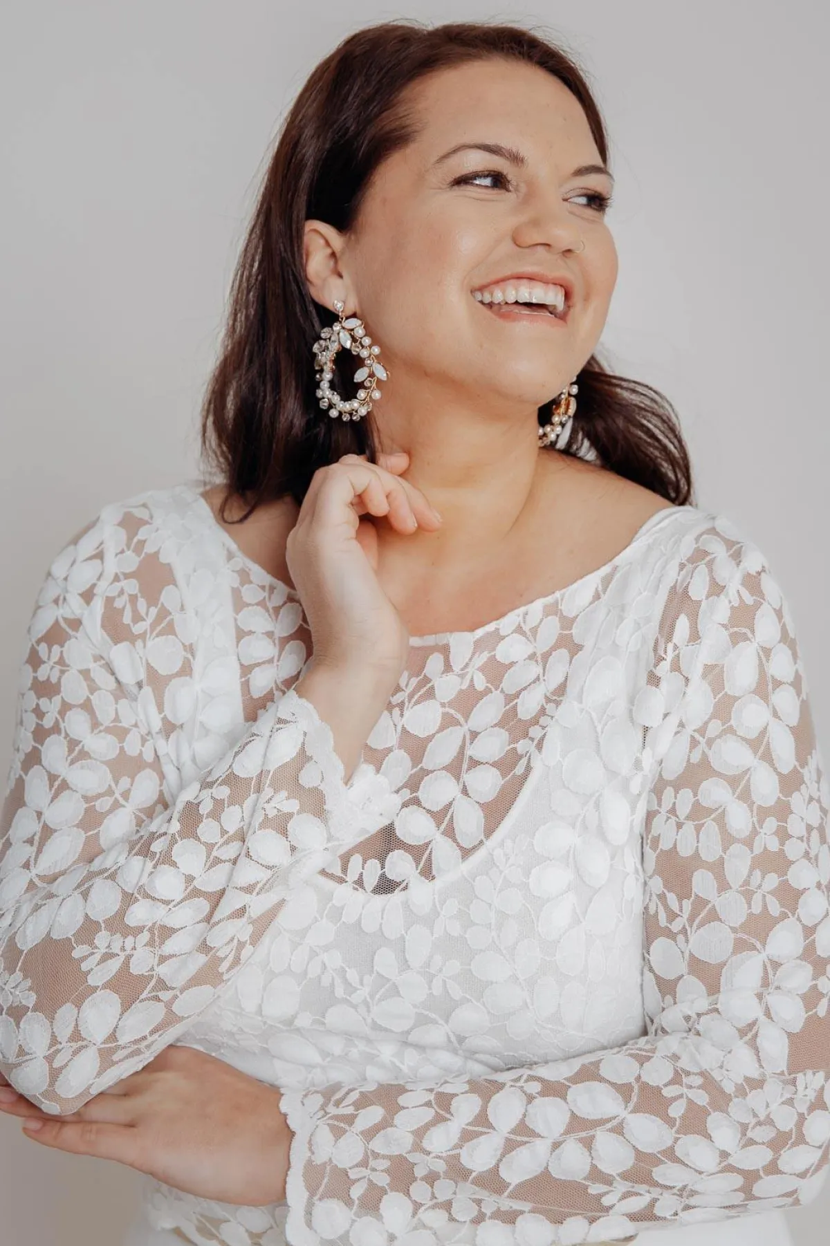 Zarte, halb-transparente Tüllspitze mit dekorativem Blättermuster, lange Ärmel und eine hübsche Bogenkante am Saum – das sind die besonderen Merkmale, die unser Norine-Top zu einem der beliebtesten noni Bridal Separates unter unseren Bräuten gemacht haben.