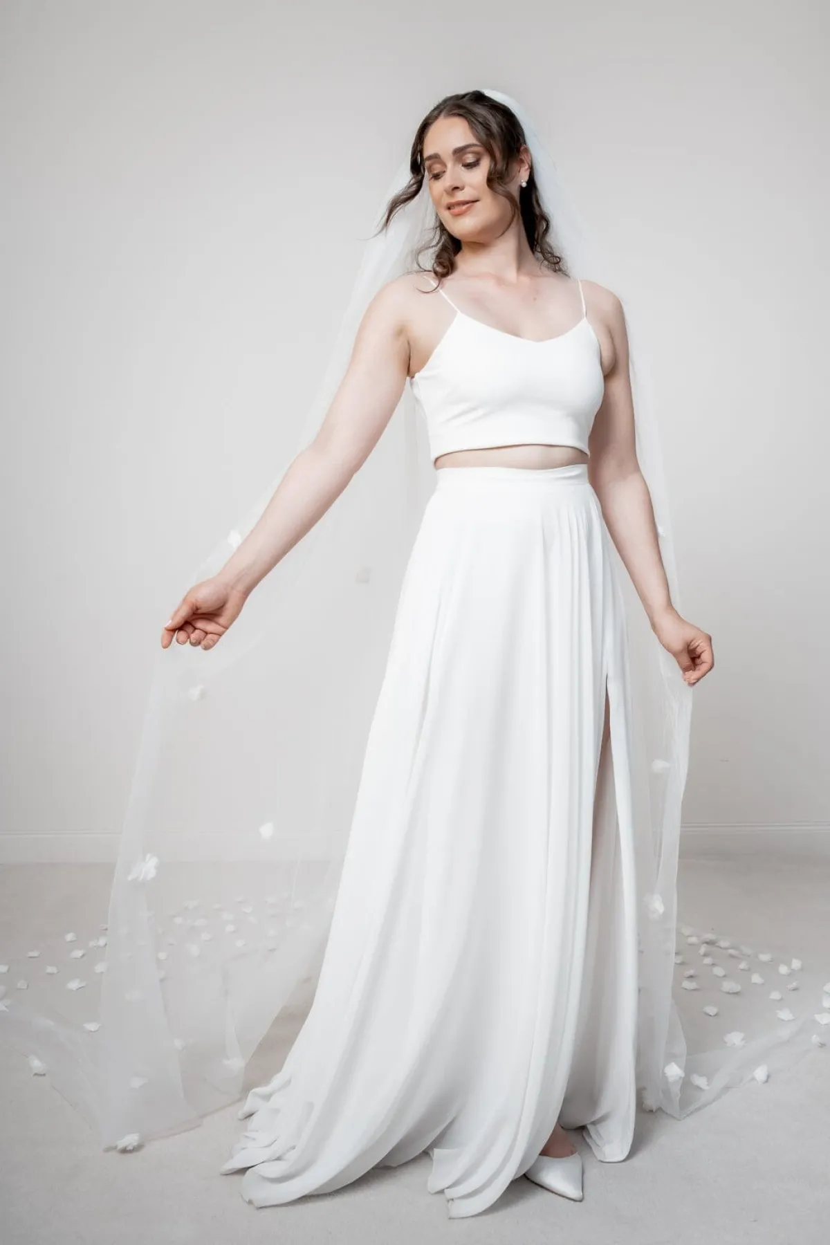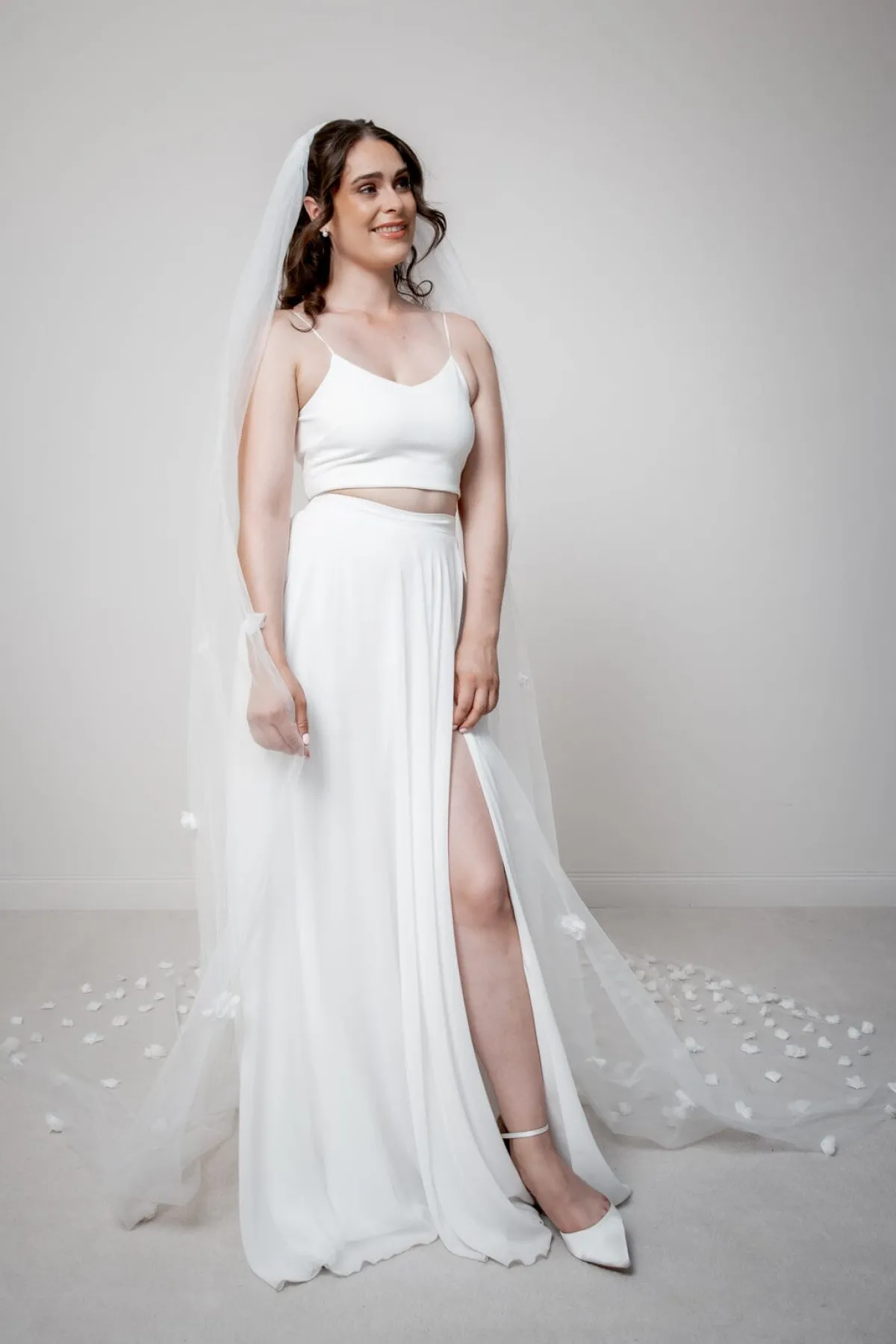 Dieser Schleier ist ein echtes Statement Piece: applizierte Blütenblätter aus zartem Chiffon enden in einer extra langen 300 cm-Schleppe für den ganz großen Auftritt . Durch die 3D-Verzierung ergibt sich ein organischer und Look, der ideal für besonders feierliche Trauzeremonien ist.