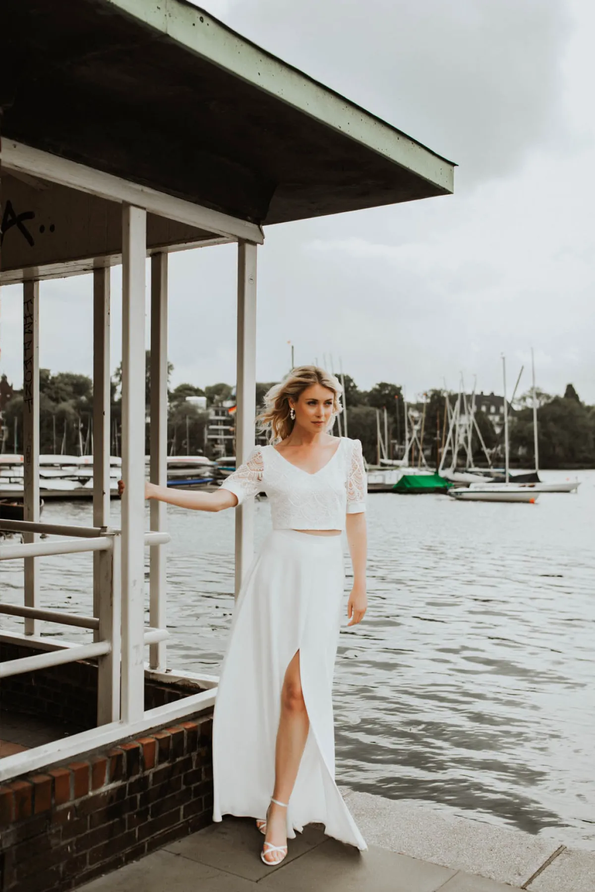 Femininer Braut Rock in A-Linie mit langem, seitlichem Schlitz bis oberhalb des Knies. Für einen sinnlichen Braut-Look, der einen großen Auftritt garantiert: der feste, elfenbeinfarbene Crêpe fällt weich-fließend bis zum Boden. Das Modell Lunamae aus schließt in der Taille mit einem schmalen Bund ab und wird hinten mit einem versteckten Reißverschluss geschlossen.