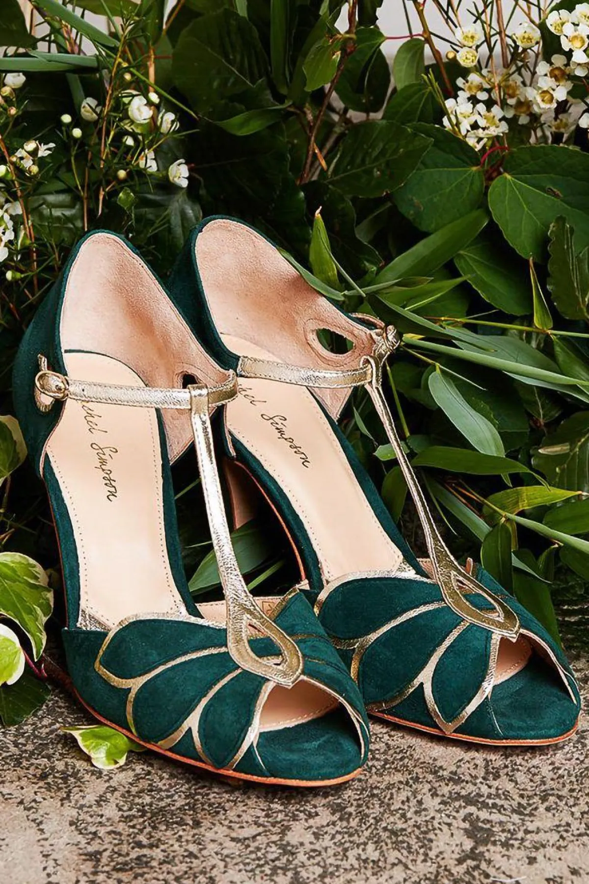 Peeptoes von Rachel Simpson aus Wildleder in sattem Tannengrün mit goldenen Details