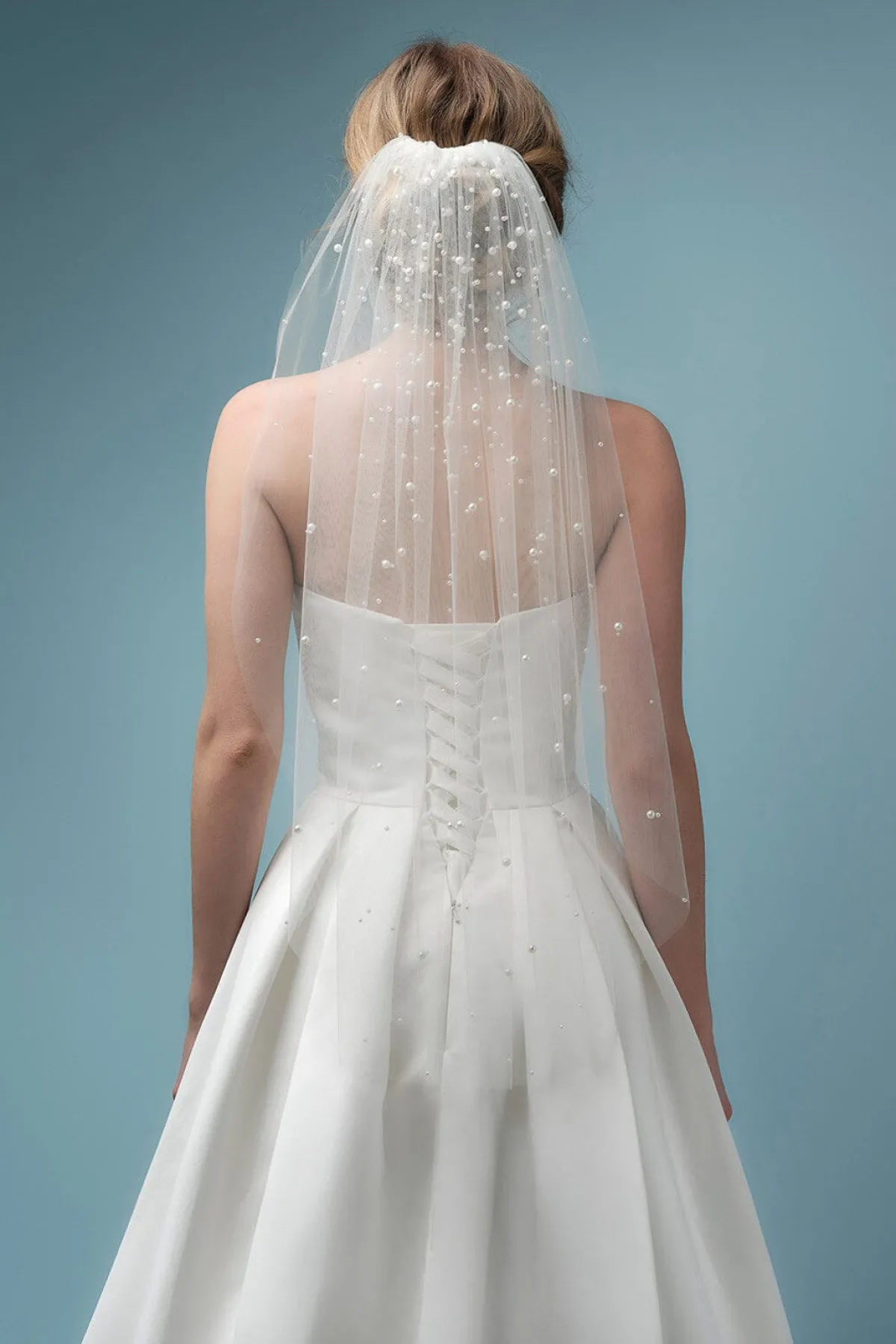 Applizierte Kunstperlen, die sich über den kompletten Schleier erstrecken, sorgen für einen romantischen und stylishen Look.