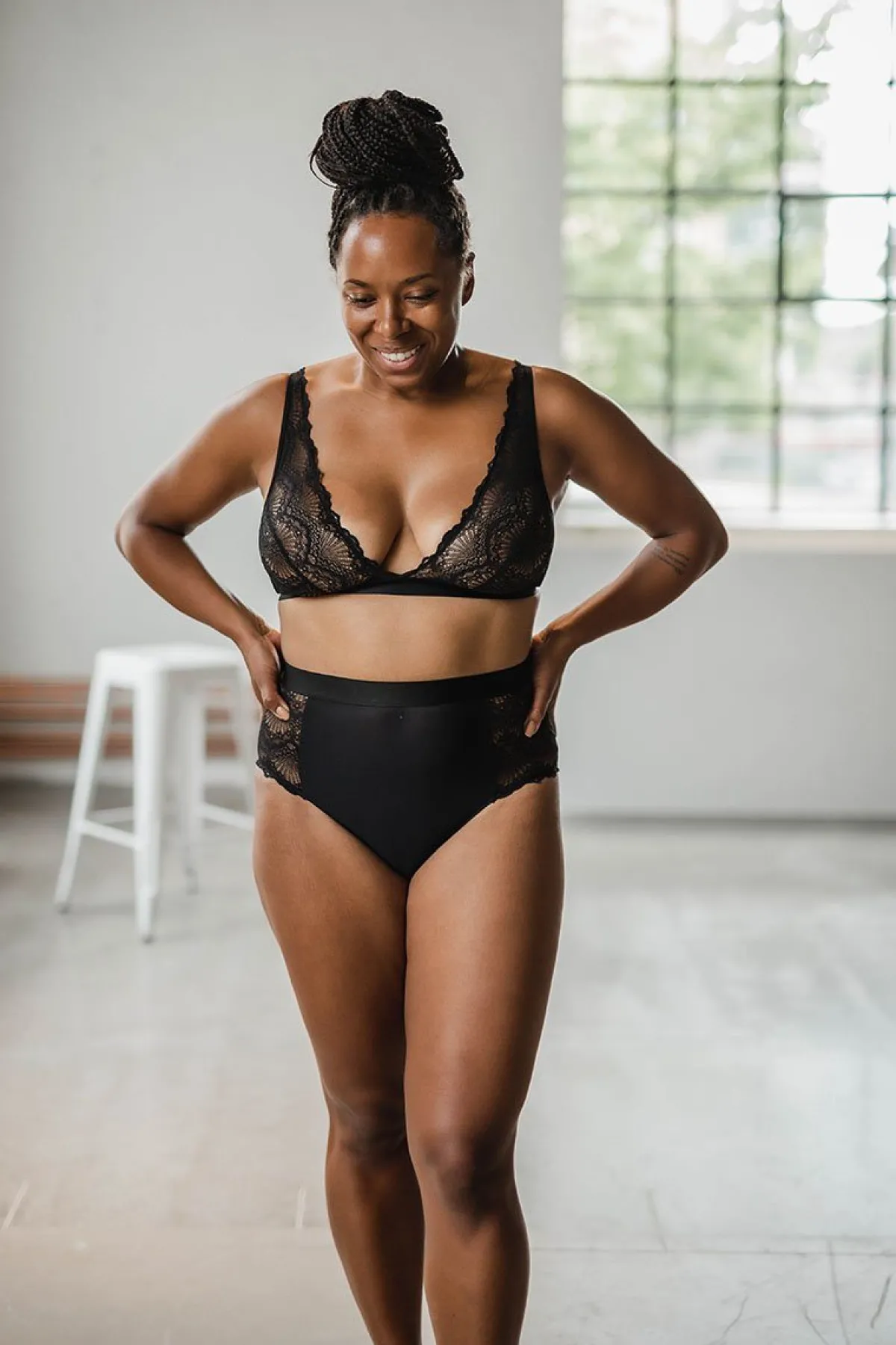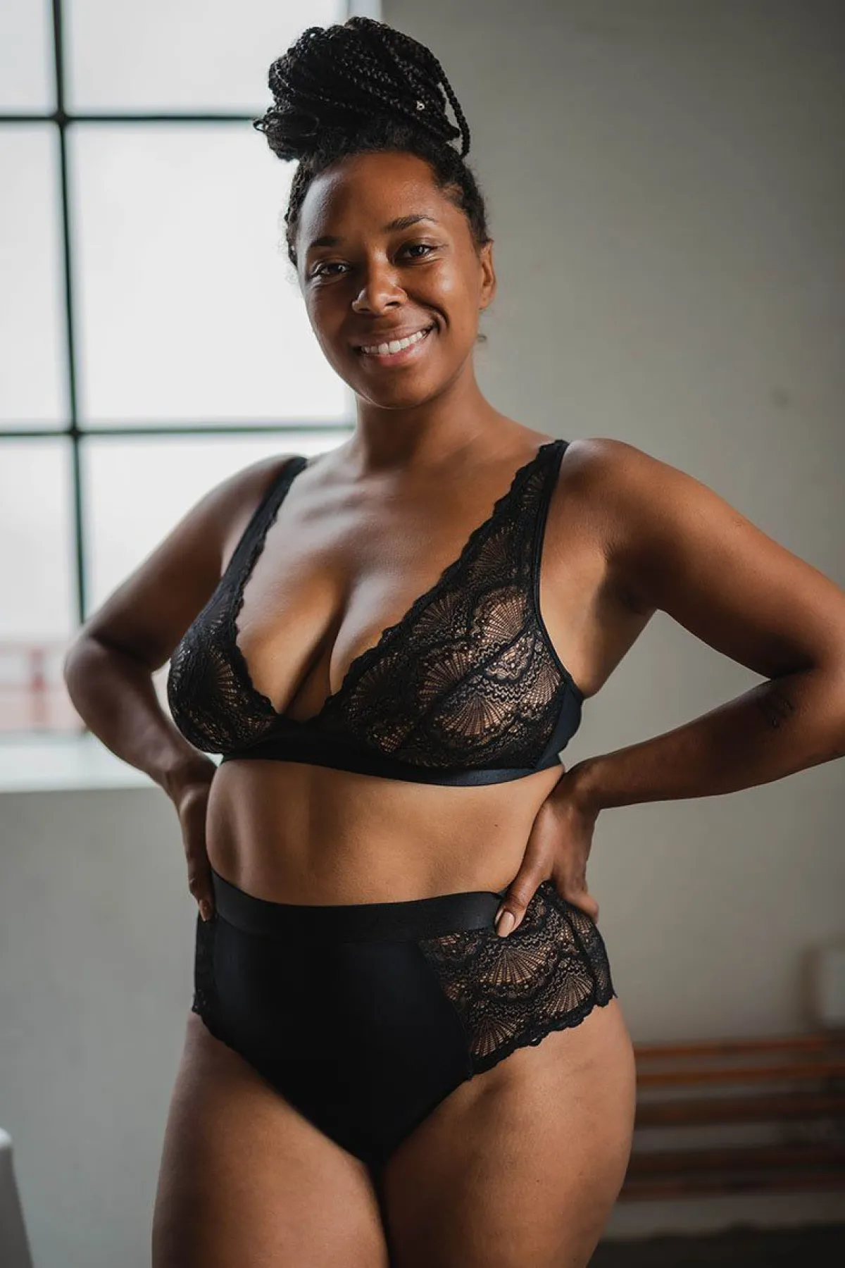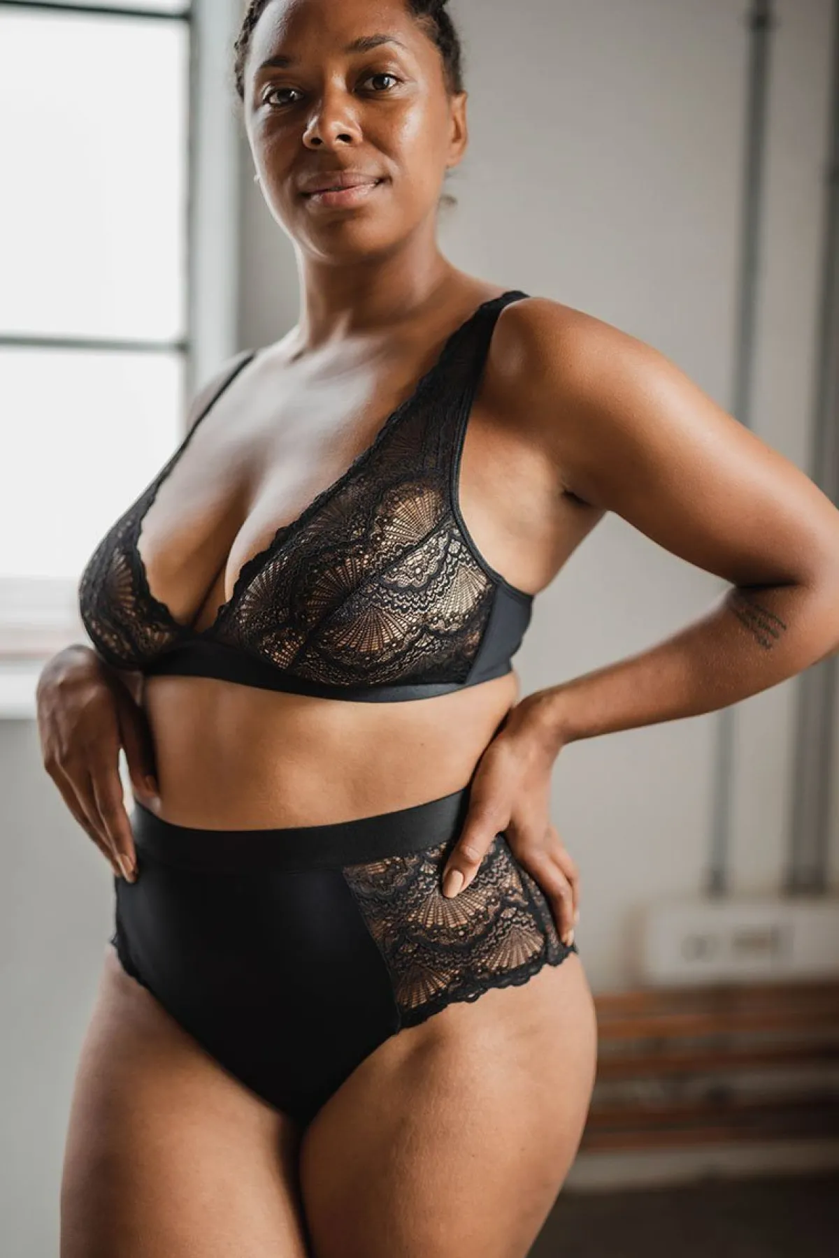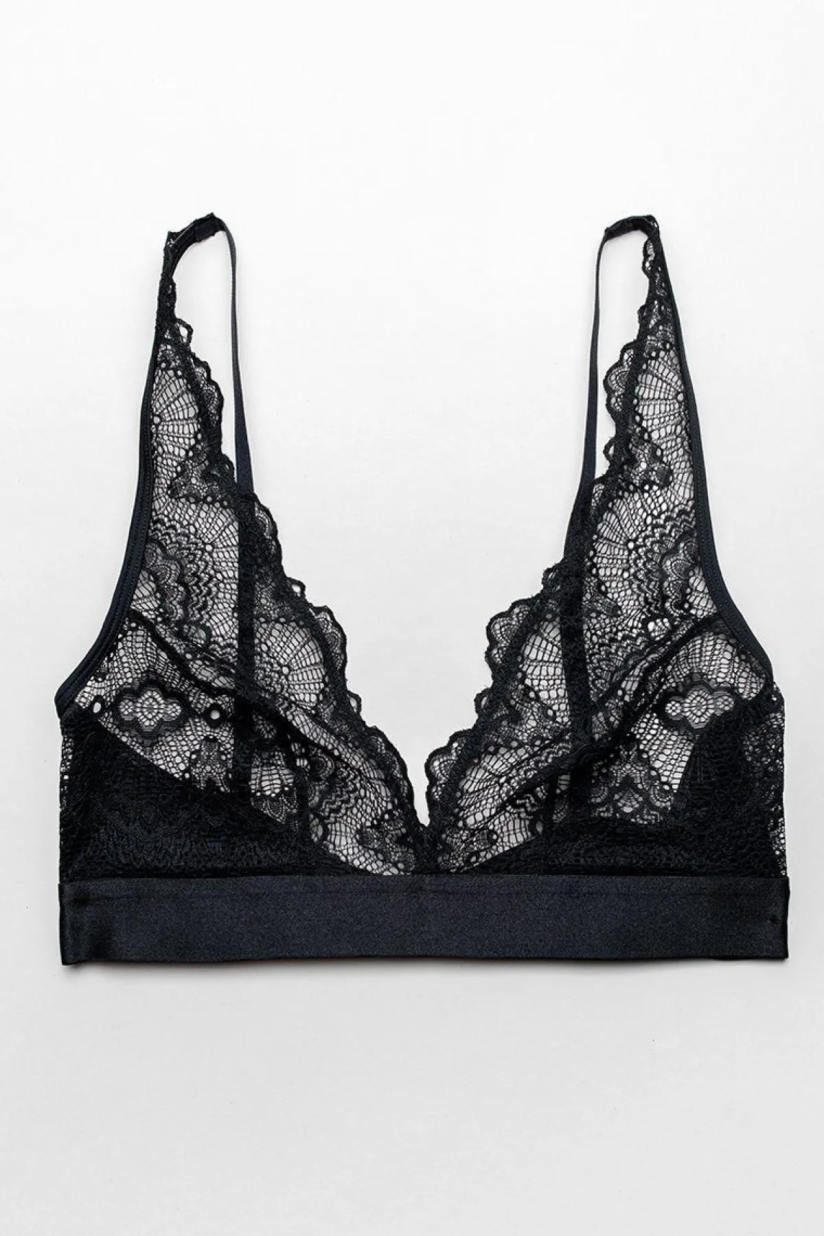 Ein wunderschönes Bralette in Schwarz, das die Brust mit bogenförmiger Spitze bedeckt. Der tiefe V-Ausschnitt betont dein Dekolleté und durch die Side Wings aus recycelter Mikrofaser hast du eine zusätzliche Bedeckung. Die Träger sowie der Bund sind in der Größe verstellbar.