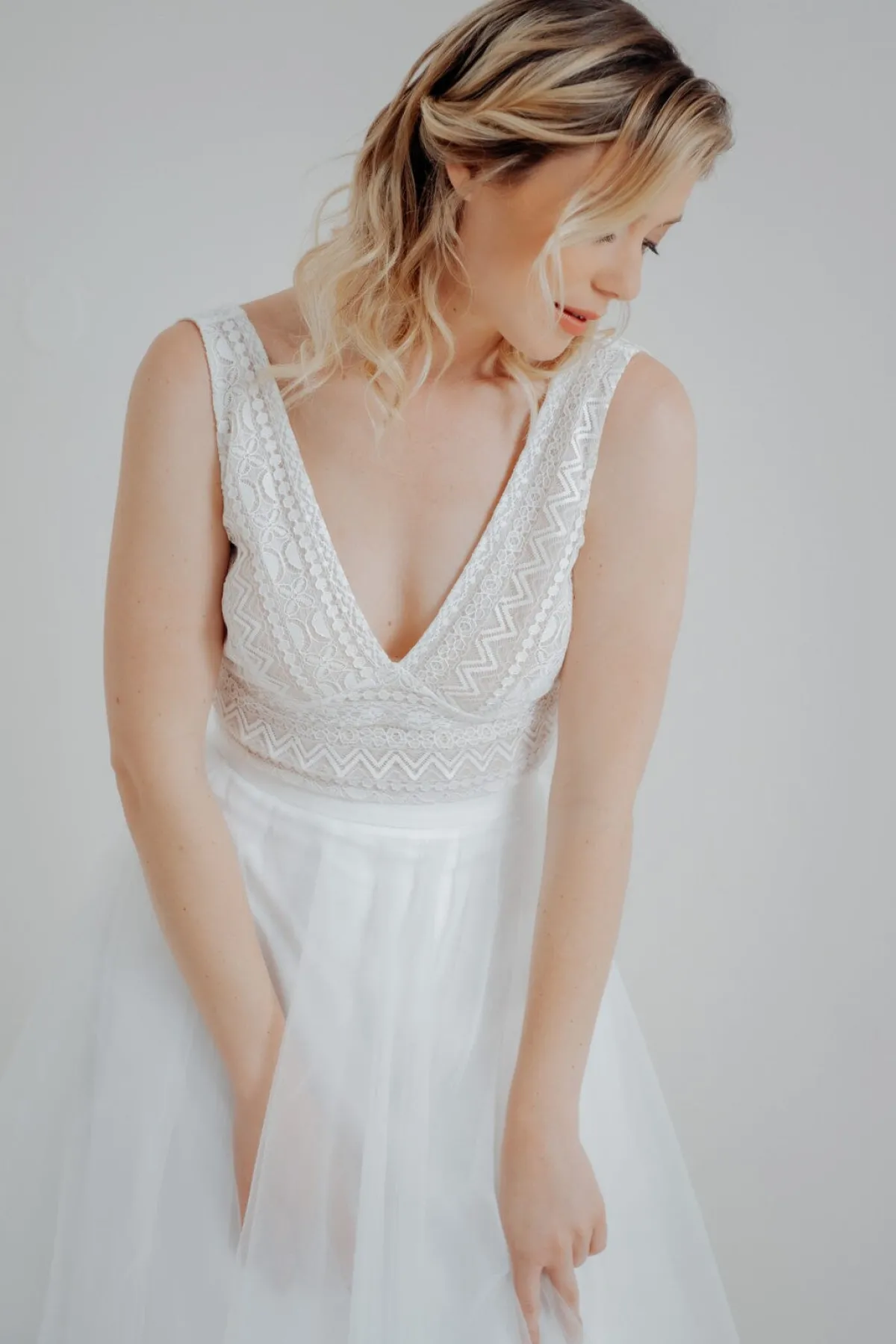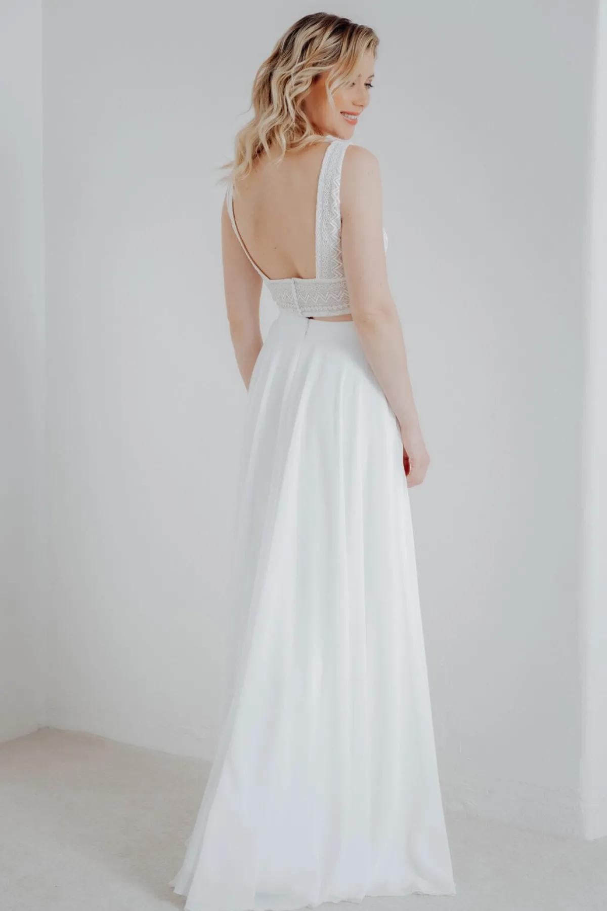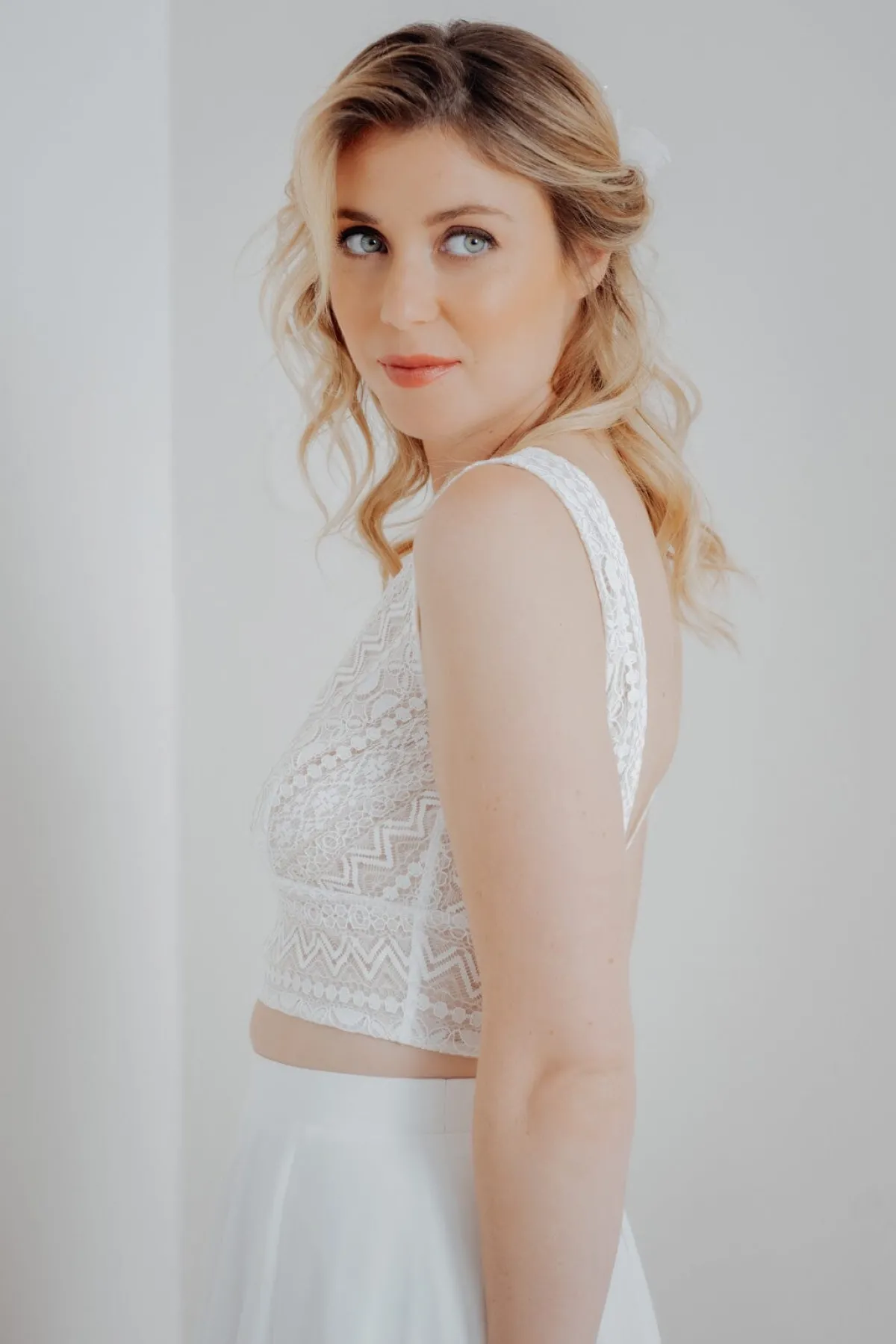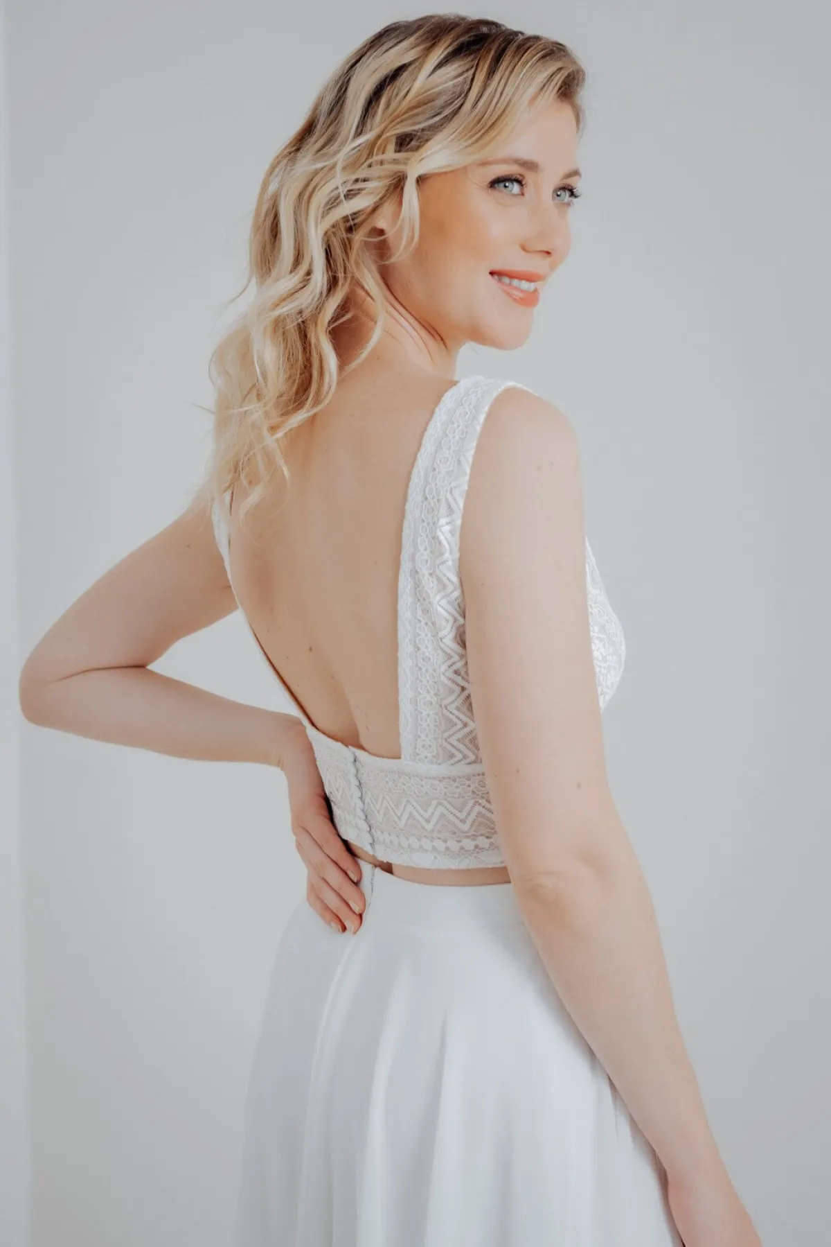 Halb-transparentes Braut Top aus Boho-Spitze mit eckigem Rückenausschnitt