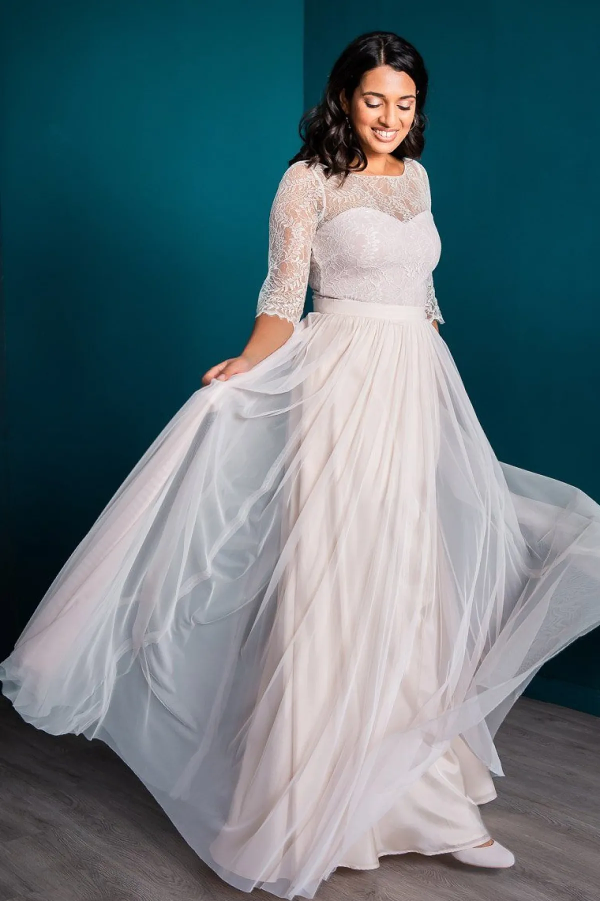 Ein duftiger, fließend fallender Rock: Die figur-umspielende A-Linie kann von jeder Braut getragen werden und kommt im zarten Puder-Rosa besonders schön zur Geltung. Für ein elegantes und feminines Maxi-Brautkleid ist der Polly-Rock ideal und kann auch nach der Hochzeit noch mit vielen Lieblingstops getragen und in Szene gesetzt werden.