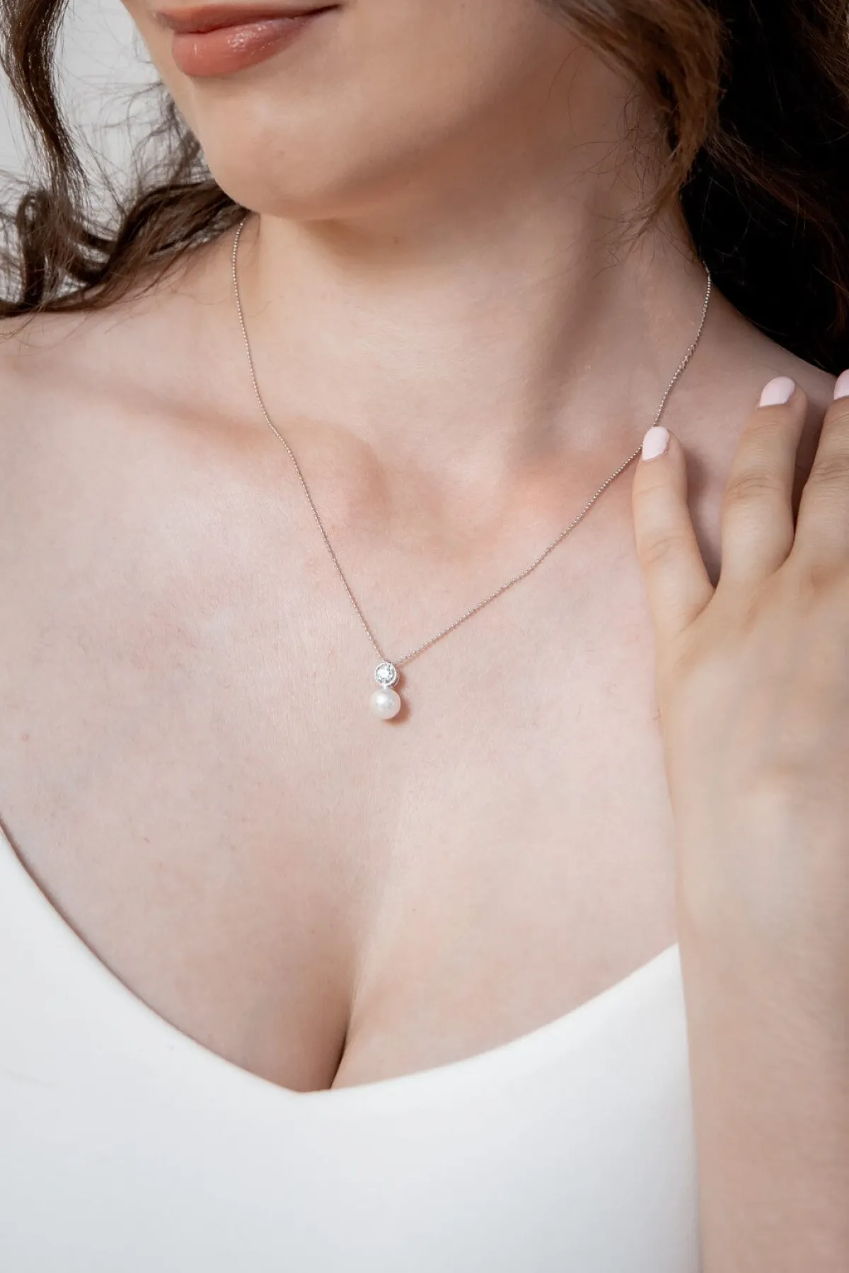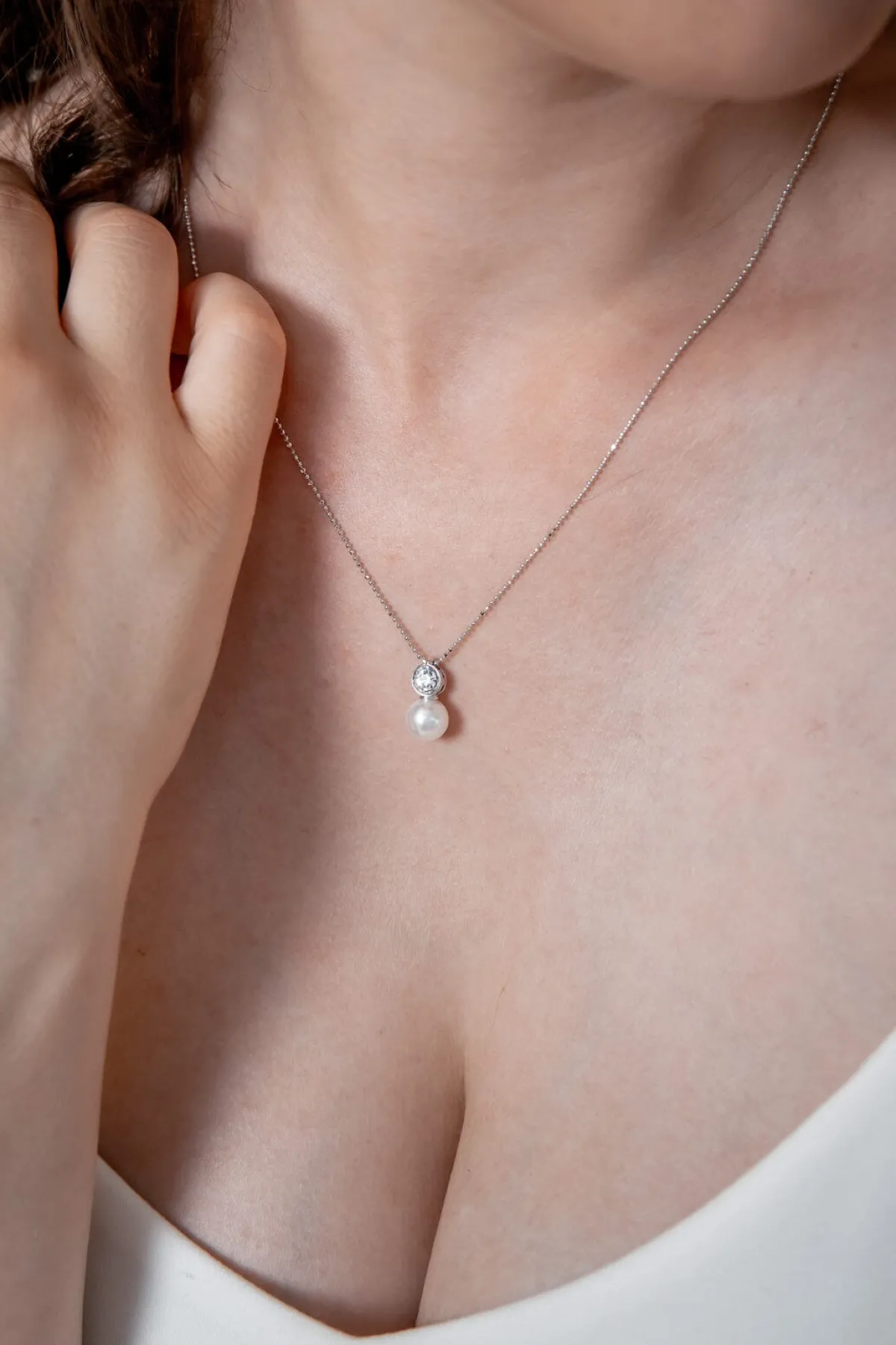 Schlichte, silberne Kugelkette mit kleinem Anhänger, bestehend aus einem Glas-Strass- und Perlenanhänger. Für jede Art von Outfit und Anlass geeignet.