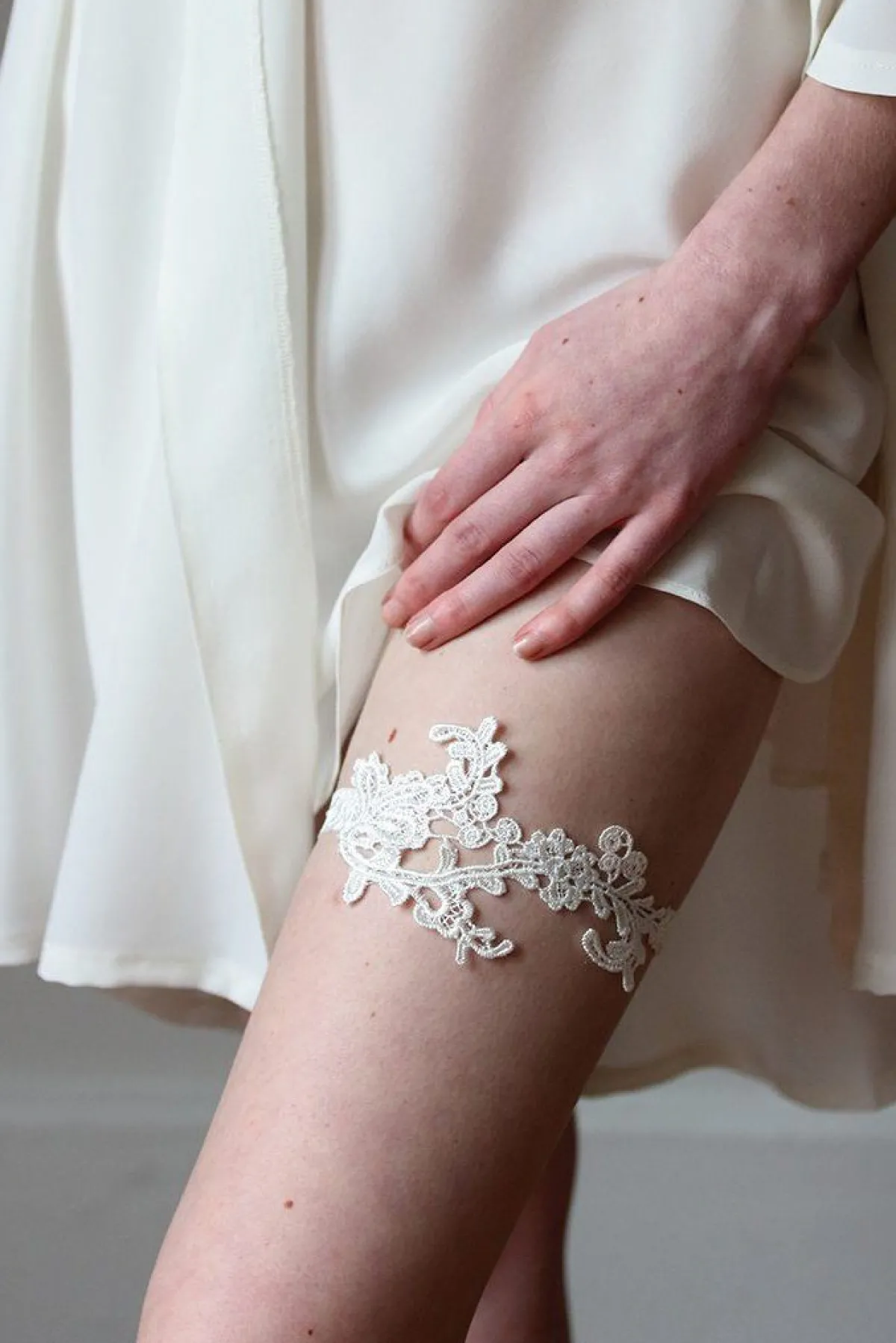 Romantisches Strumpfband mit Spitze in Ivory für einen vollendeten Brautlook. Das traditionelle Accessoire für die Hochzeit besteht aus schlichter, weicher Spitze und einem Gummiband, das sich durch das elastische Material deinem Oberschenkel anpasst. Das Strumpfband ist in klassischem Hochzeits-Weiß gehalten und passt ideal zu einem Brautkleid im Boho-Stil.