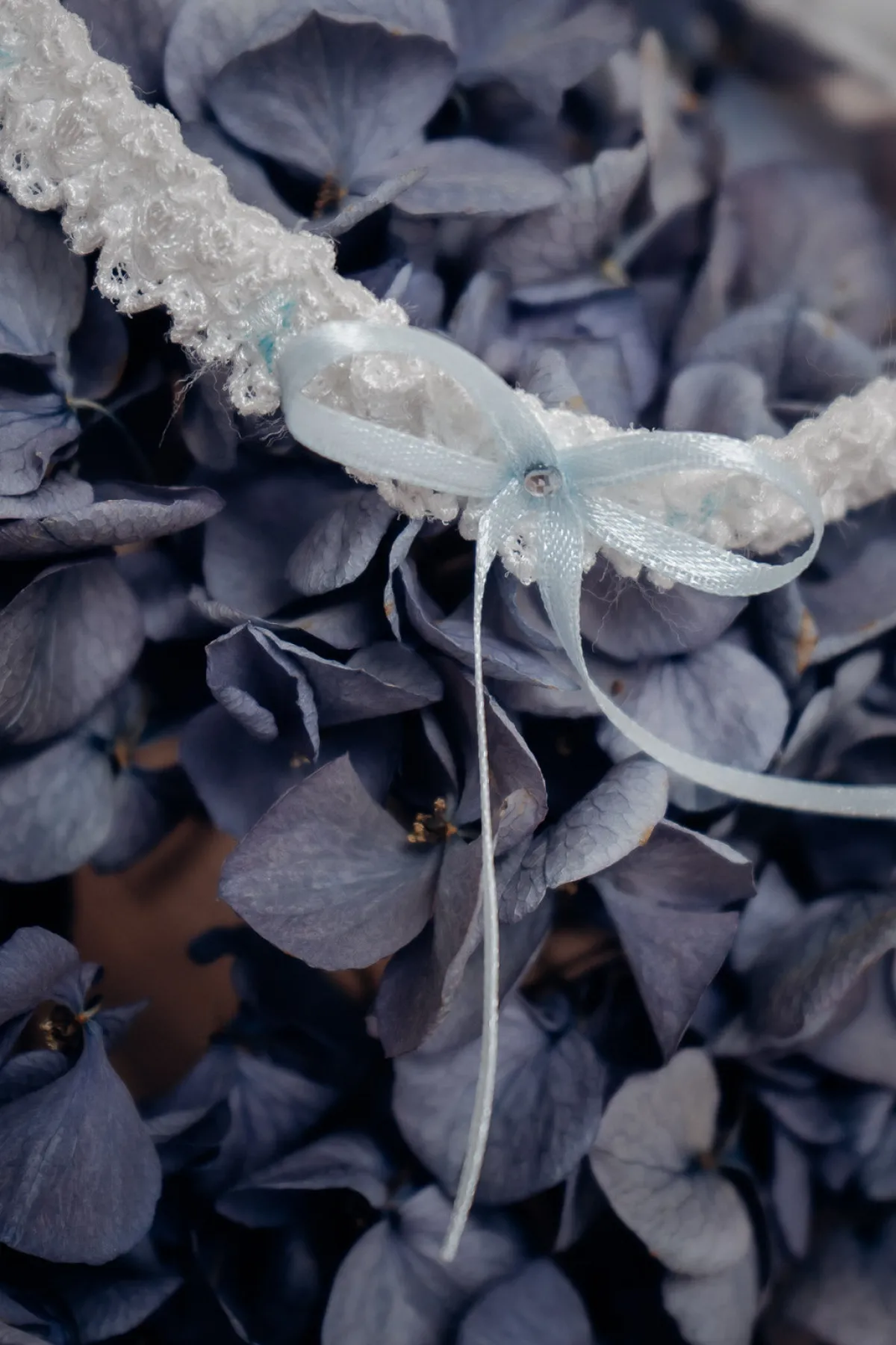 Auf der Hochzeit darf ganz traditionell Etwas Blaues nicht fehlen: dieses süße Strumpfband mit blauer Zierschleife und kleinem Strass-Stein ist genau das richtige Accessoire für einen abgerundeten Hochzeitslook.