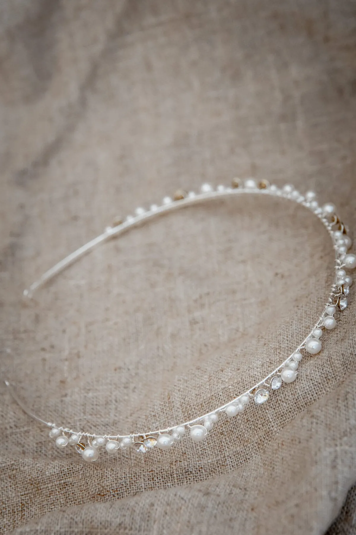Schmales Diadem in Silber mit unterschiedlich großen Urea-Perlen und Strasssteinchen für einen romantischen Look.